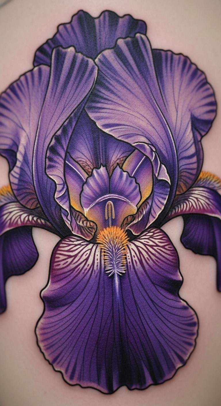Focus on purple petals for a rich iris tattoo. Deep hues make it stand out. Grab it for $50. Color in drawings at home. Highlight the petals. This design dazzles. Cut costs with one shade. Book fast. This look pops. Tools test the tones. Shine bright.