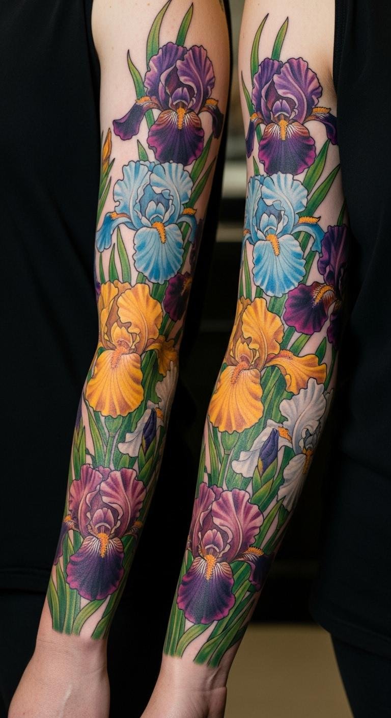 Build a multi-colored iris sleeve for full arm art. Layer colors across the skin. Hunt for $100 packages. Draw sections at home. Fill the space creatively. This design covers boldly. Budget by adding gradually. Spread out visits. This option expands art. Digital plans guide. Sleeve it on.