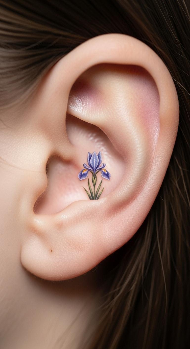 Place a small iris behind your ear for secrecy. A tiny flower fits perfectly. Find it for $30. Sketch it on your ear. Keep it discreet. This spot surprises. Save with small size. Quick sessions work. This idea hides well. Markers test it. Ear it proudly.