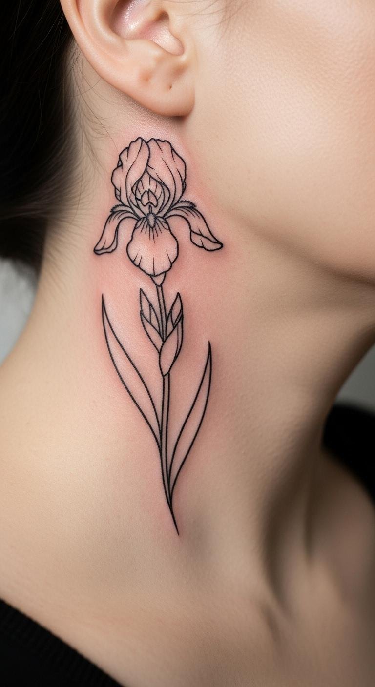 An outline iris on your neck offers a sleek touch. Just black lines make it stand out without color. Look for deals at walk-in shops for around $60. Sketch it yourself on paper to plan ahead. Add a small leaf for extra flair. This area draws eyes but covers easy with hair. Opt for thin lines to keep it light. Save by going monochrome. Book a session that lasts less than an hour. This idea fits professional settings. Try tracing templates at home with a pencil. Walk away with a design that feels refined.