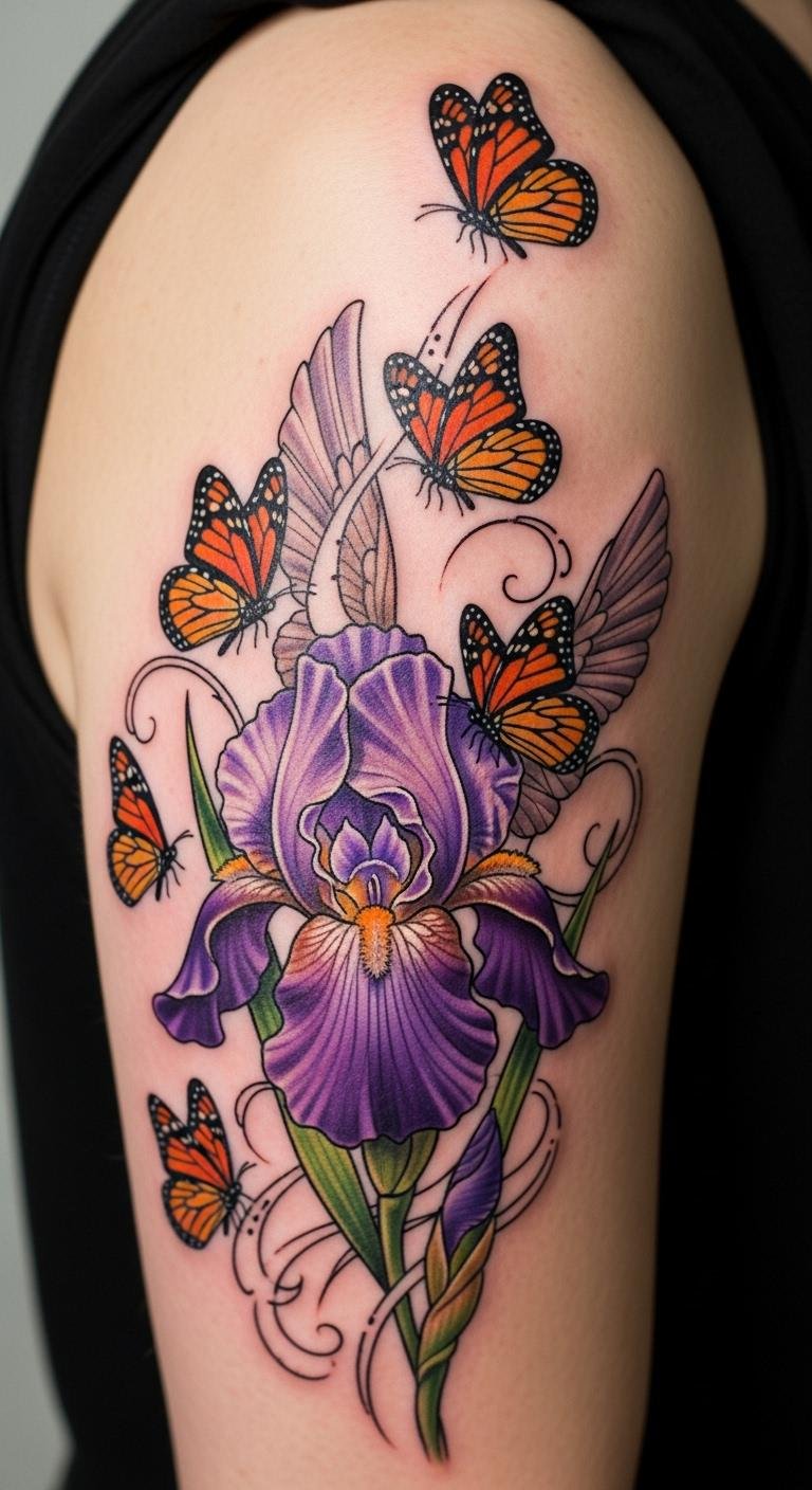 Add butterflies to your iris for whimsy. Wings around flowers bring movement. Get it for $80. Draw both on paper. Mix elements playfully. This design flies high. Save by keeping it light. Time it right. This idea adds life. Home art combines. Flutter into fun.