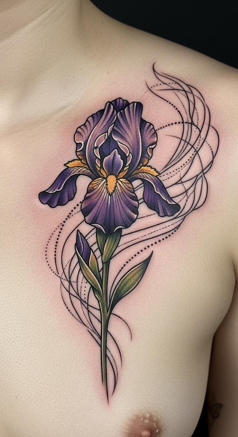 A symbolic iris on your chest means something deep. Pair it with a simple motif. Seek out affordable pros for $100. Jot ideas in a notebook first. Use the flower for personal vibes. This spot feels close to heart. Trim expenses with basic elements. Set up visits smartly. This option speaks to you. Home doodles guide the way. Carry meaning every day.