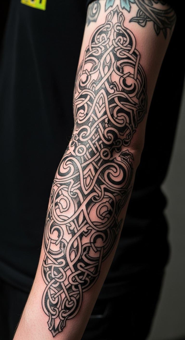Think about a Celtic knot sleeve for a timeless look that shows unity and eternity. This design wraps around your arm like an ancient story. Start with a simple sketch on paper to plan it out. Use free online templates from sites like Pinterest to draw your own version at home. Pick a local artist who specializes in line work; they often charge less for smaller sessions. Go for black ink to keep costs down, around $100–$200 for a basic one. Add personal touches, like blending in family initials, for a unique twist. Break the process into steps: research designs first, then get a consultation. This way, you avoid extra fees. Keep it practical—wear long sleeves during healing to protect it. Try sketching with a pen on your skin to see how it flows. Focus on what works for you, like placing it on your non-dominant arm for daily ease.