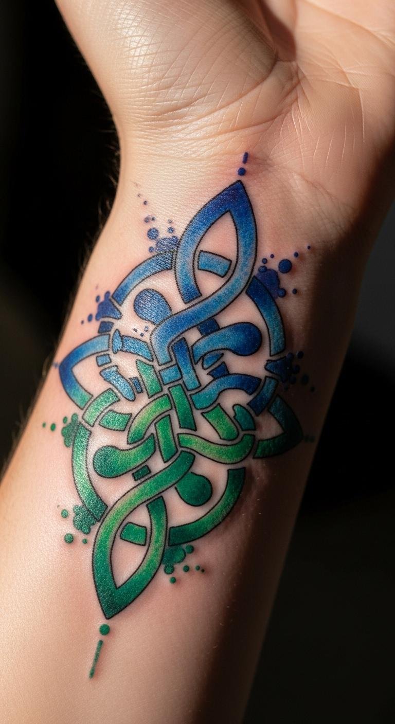 A watercolor Celtic knot band on your wrist adds a fluid, artistic touch. Colors blend like paint. Experiment with watercolors at home to mimic the look. Free tutorials online guide your sketches. Expect $150–300, but ask for watercolor deals. Stick to two colors for savings. Customize the knots with your theme. Plan ahead: paint a sample on paper. Wrist bands are versatile for daily wear. Preview with body paint if you can. Keep it fun and light.