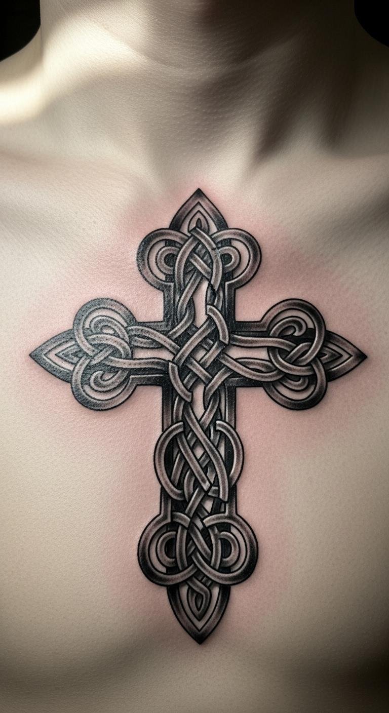 Blend knots and a cross on your chest for a heritage mix. This combo packs symbolism. Sketch the merge on paper with basic tools. Free fusion ideas abound online. Prices hit $250–500. Use simple blends to cut costs. Make it yours with added details. Plan in parts: draw the cross base. Chest tattoos show commitment. Use tape to outline first. Focus on what fits you.