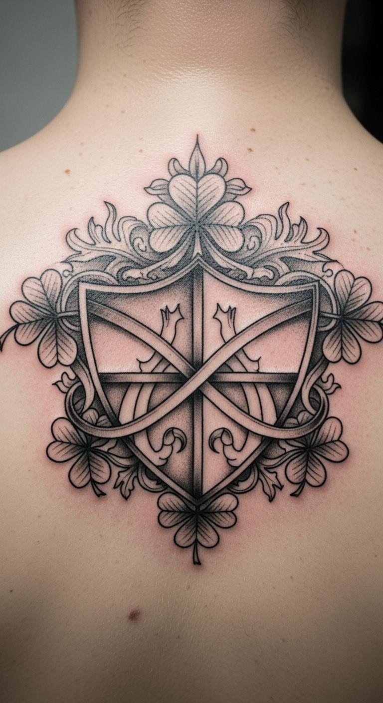 A family crest with shamrock on your back celebrates roots. Design it around your story. Draw your crest at home using family photos. Online creators offer free templates. Expect $180–350. Keep it outline-based. Add shamrocks for flair. Build slowly: sketch the shield. Back space allows for big ideas. Preview with drawings. Make it personal and affordable.