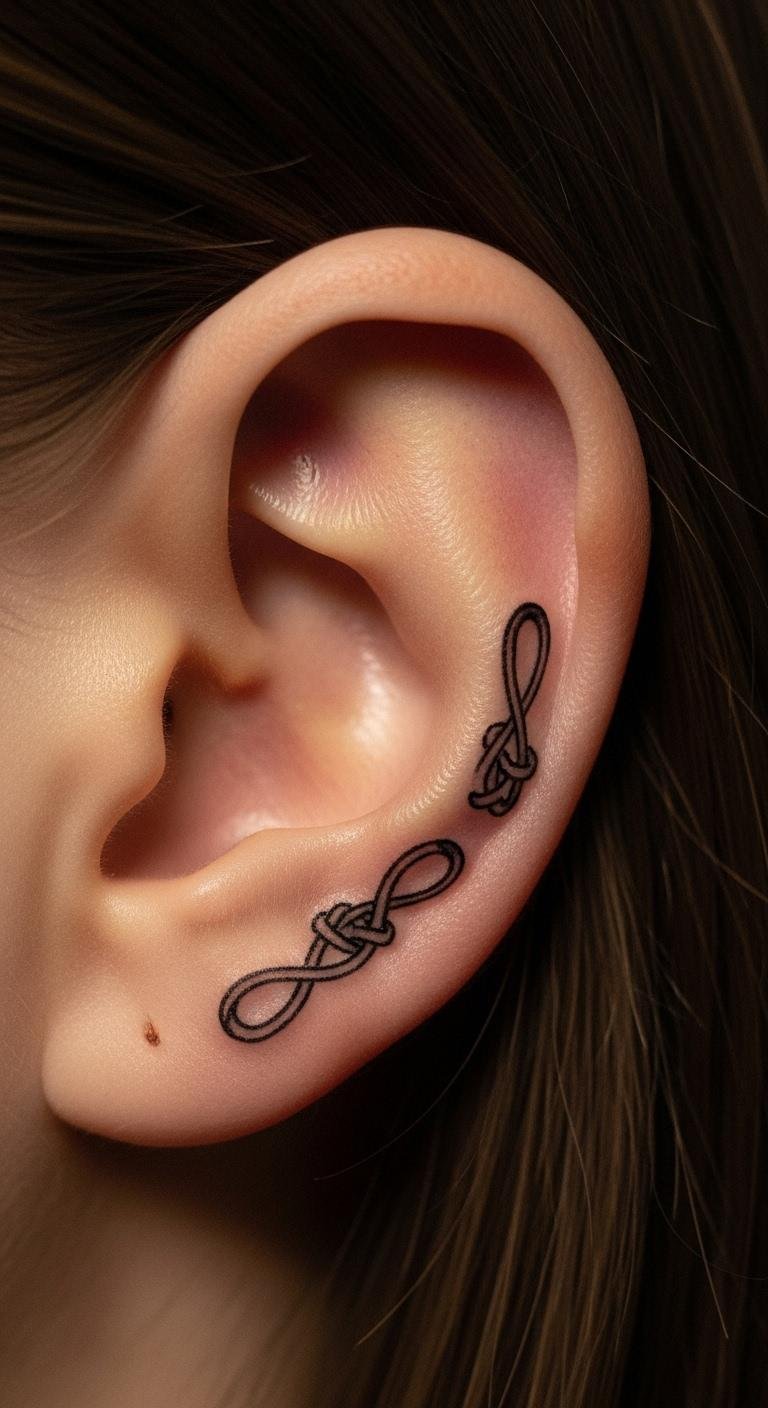 Subtle knot “earrings” on your ear add a playful touch. Tiny loops shine. Draw them on paper for size. Online ear tattoo ideas are free. Cost $30–80. Keep them minimal. Make them match your style. Test with dots: mark your ear. Ears heal fast. Find quick inspo. Easy and cheap.