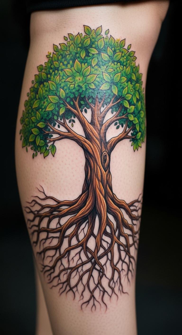 A colorful tree with roots on your leg shows growth journeys. Vibrant shades pop. Paint a mock-up at home. Free color palettes online help. Expect $200–400. Use few colors. Personalize the roots. Sketch step by step. Legs offer space. Preview with markers. Keep it vibrant yet simple.