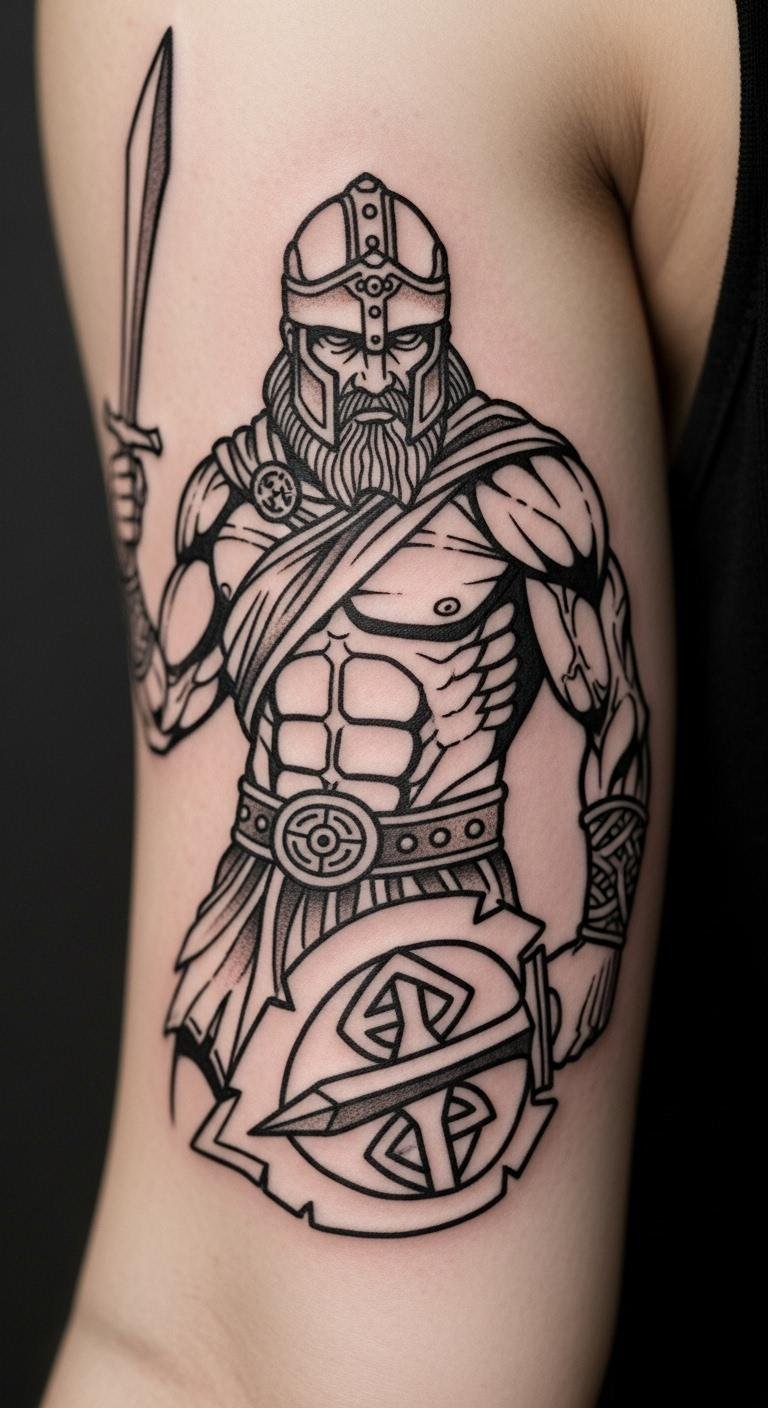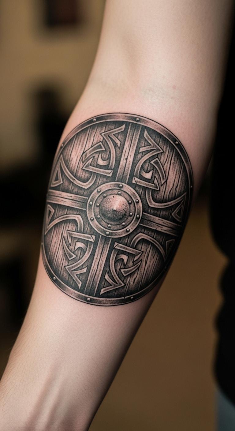 A warrior shield on your forearm stands for protection. Solid shapes work well. Draw it with shapes on paper. Free shield designs online guide you. Cost $100–200. Stick to outlines. Add your symbols. Plan the layout: trace first. Forearms are practical. Use references for ideas. Make it strong.
