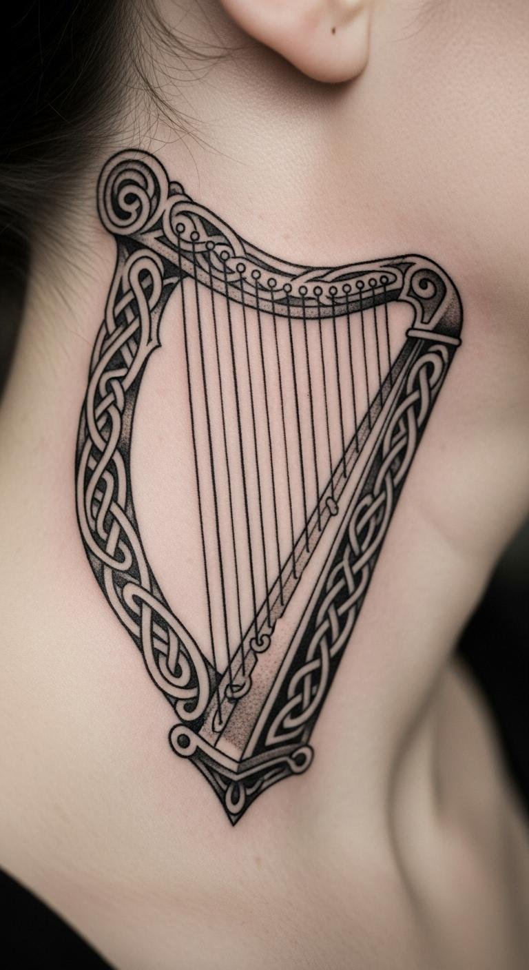 A harp and knot combo on your neck mixes music and heritage. Small designs fit. Sketch the pair at home. Online combos are free. Prices $90–180. Use clean lines. Customize the strings. Draw a test: pen it on. Necks are bold choices. Gather inspo quickly. Affordable option.