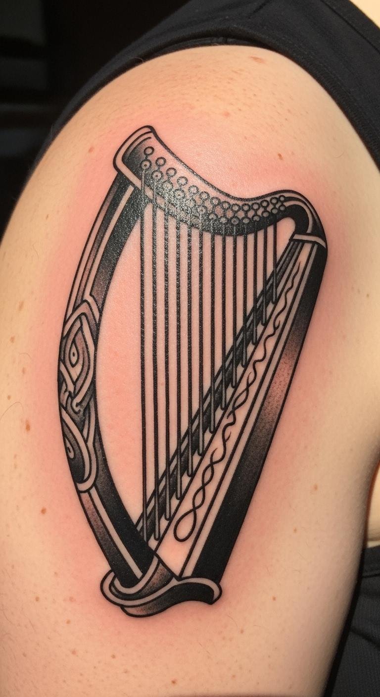 An Irish harp on your shoulder celebrates music and identity. This compact design sings with meaning. Sketch the strings at home on scrap paper. Free design banks online provide shapes to use. Artists often price it at $90–180. Go with clean lines for simplicity. Personalize by curving it to your shoulder. Build it gradually: draw the outline first. Shoulder spots are great for showing off or hiding. Snap photos of your sketches to review. Keep costs low with basic ink.