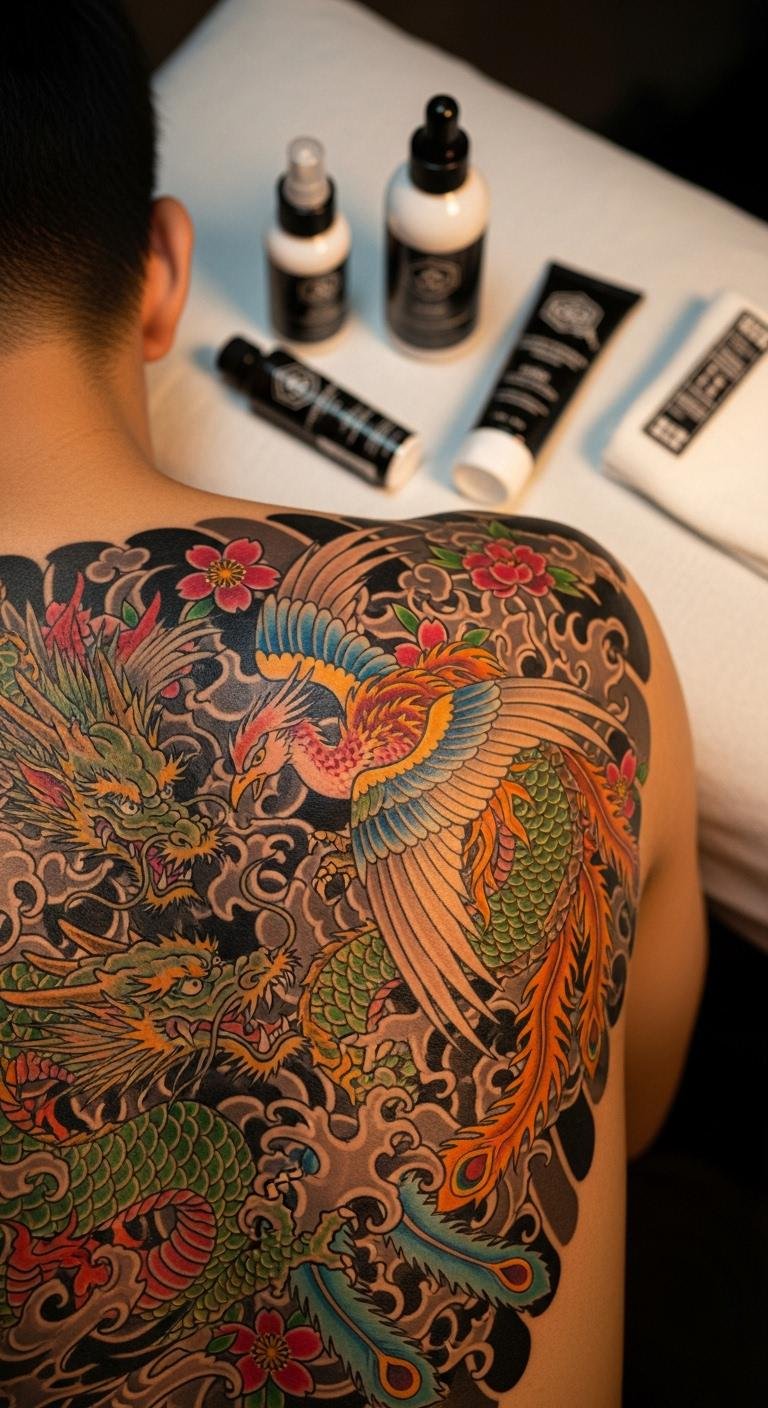 Care for your back tattoo post-session. Clean gently daily. Moisturize with basics. Avoid sun initially. Wear loose clothes. Follow simple steps. It heals well.