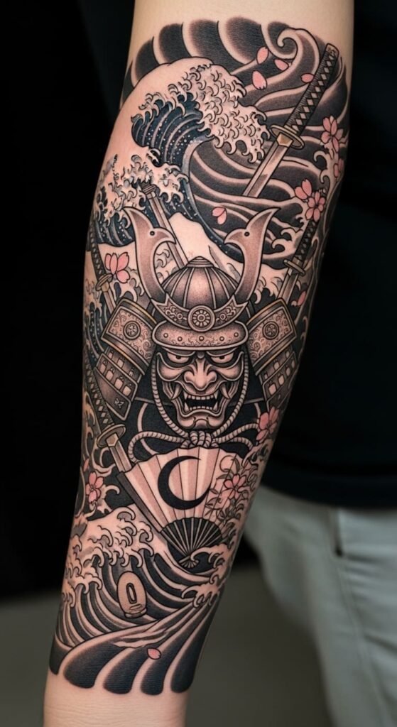 Waves with samurai bring in themes of bravery and protection. Envision a samurai standing firm against the waves on your forearm. This design tells a story of inner strength. Find affordable artists by looking at community events or online reviews. A budget idea: start with a basic outline session and add details later. Practice the pose with drawings at home using free tools. Keep the size modest to save on time and money. Bold this: start with outlines. It helps you build your tattoo step by step, making it practical for real life.