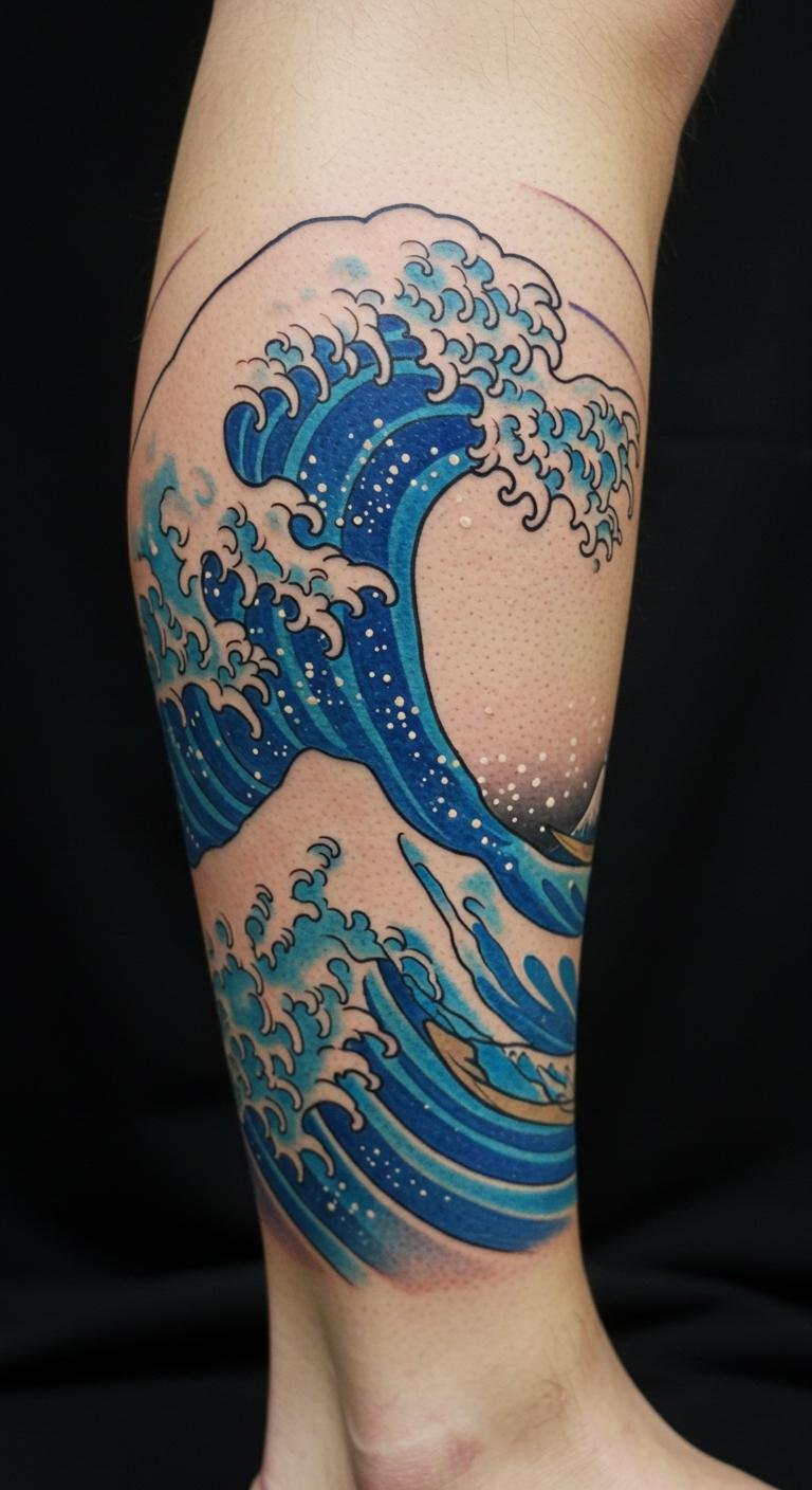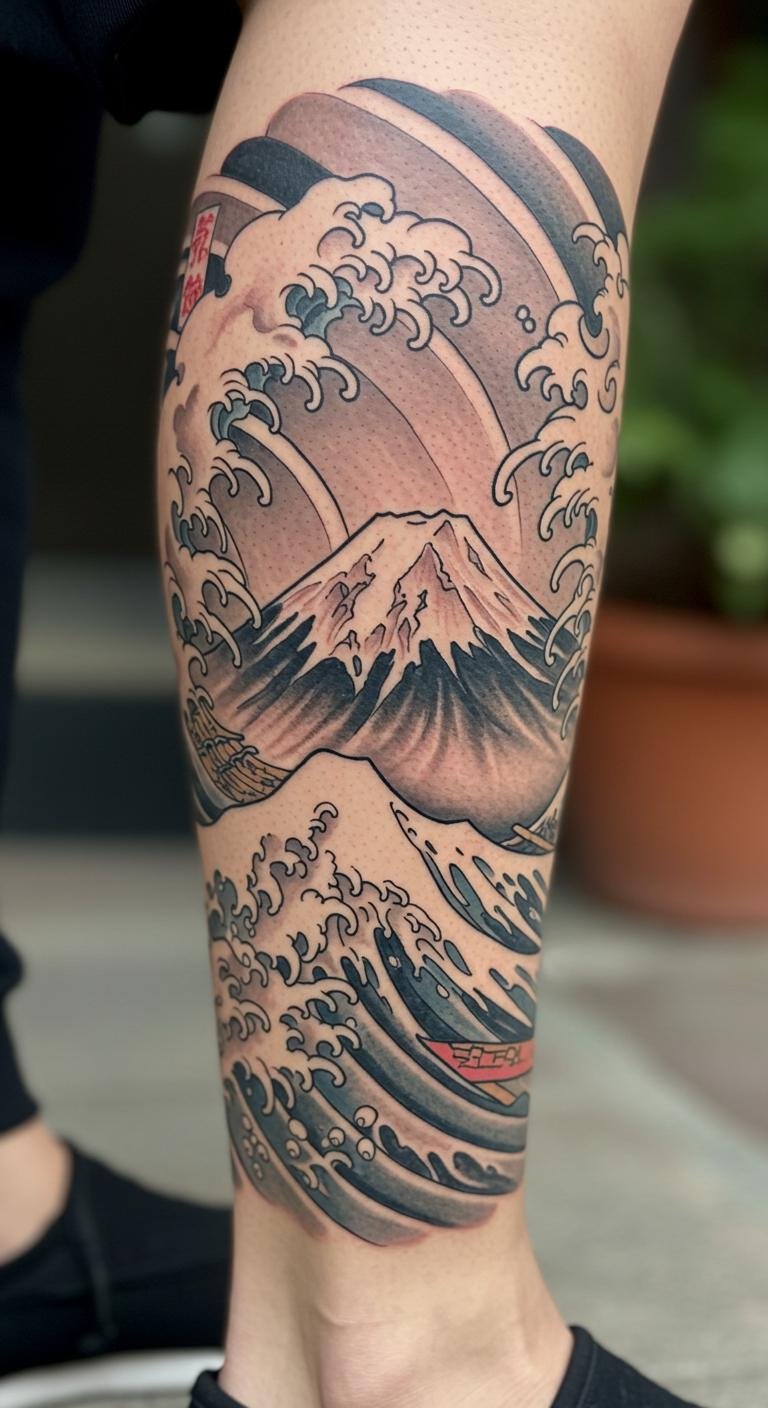 Waves with Mount Fuji combine nature’s icons for a powerful image. Picture the peak emerging from waves on your calf. Adapt it to fit your space. Find free images online to inspire your version. A tip: scale it down for shorter sessions. Bold the point: inspire from images. This makes it achievable on a budget.