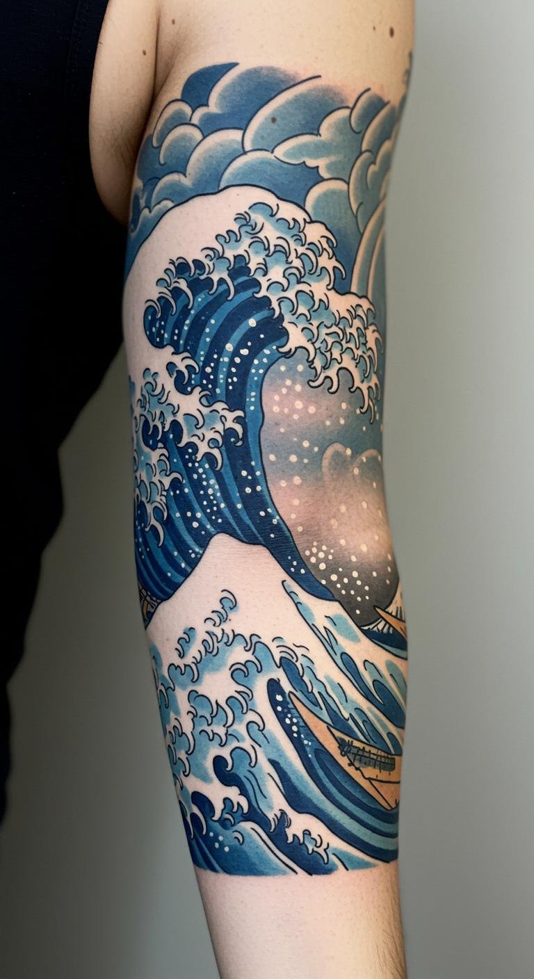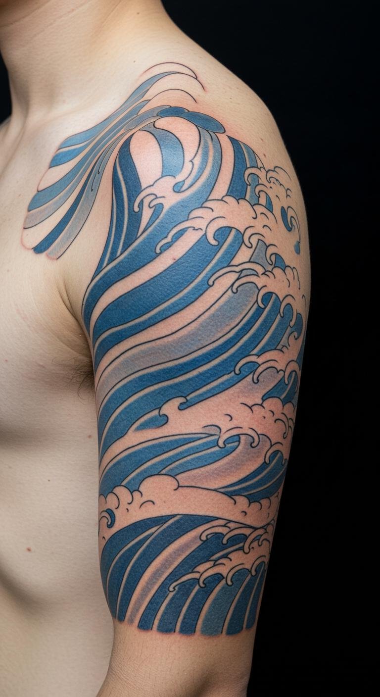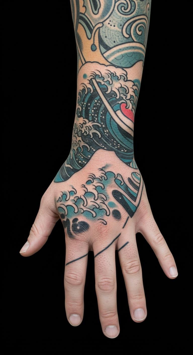 A full sleeve wave pattern covers your arm in a sea of motion, creating a bold statement. Imagine waves wrapping from shoulder to wrist, blending seamlessly. This works for those wanting a big impact. Start small by getting quotes from local artists and pick one with portfolio samples. A budget tip: break the tattoo into sessions, like one wave at a time, to spread costs over months. Use string or tape on your arm to map the design beforehand—it’s free and helps visualize flow. Focus on aftercare with basic lotions from your medicine cabinet. Bold this: map it out. This method makes the process manageable and affordable, turning your sleeve into a wearable art piece.