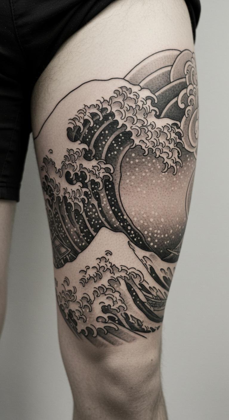 Black and grey waves offer a timeless look with shading on your leg. Use grey scale apps for planning. A budget option: focus on shading techniques. Bold the tip: use apps. It simplifies the process.