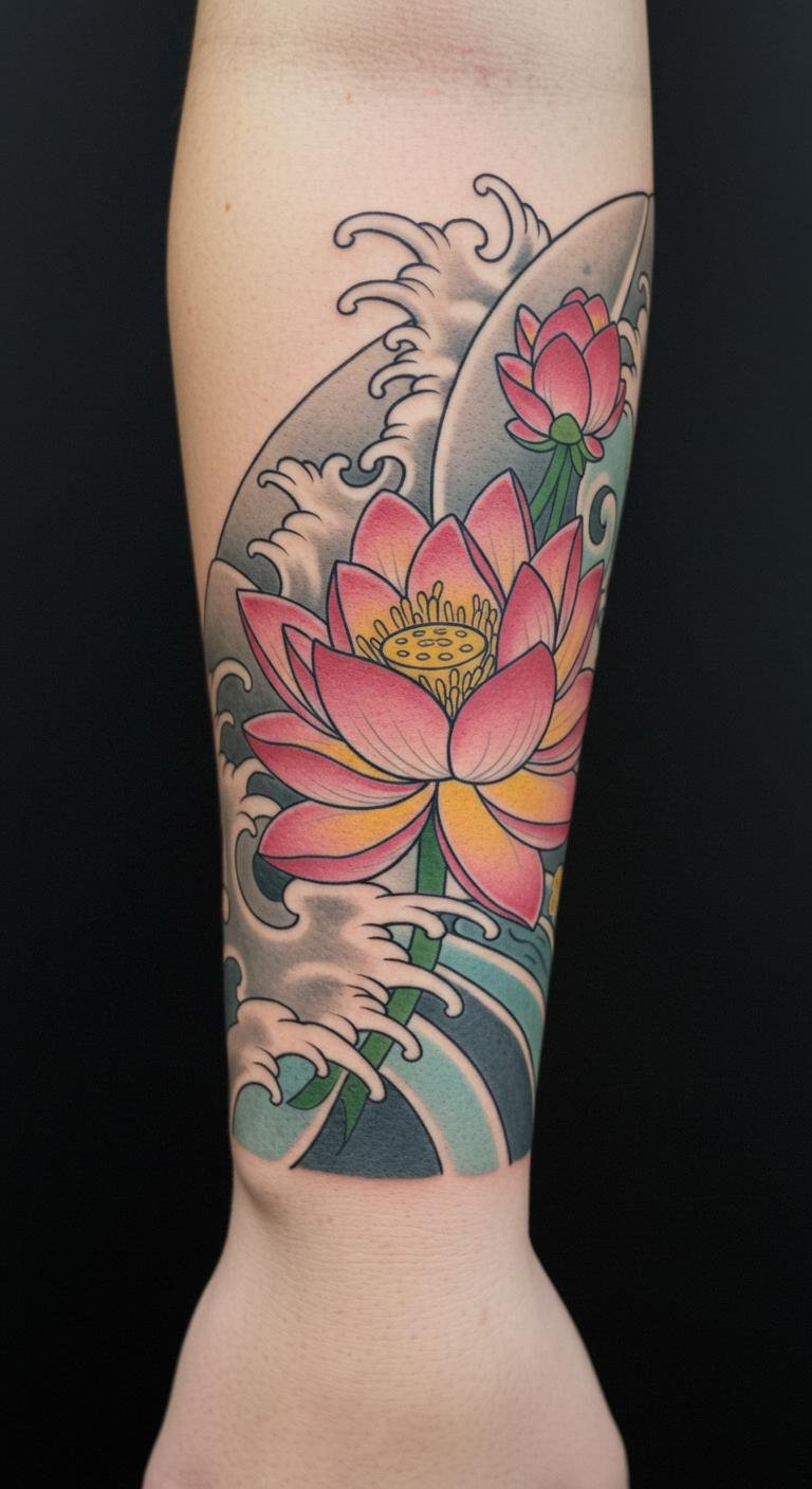 Waves with a lotus add purity and growth on your wrist. Sketch the flower simply. A tip: combine elements wisely. Bold this: sketch simply. It keeps costs low.
