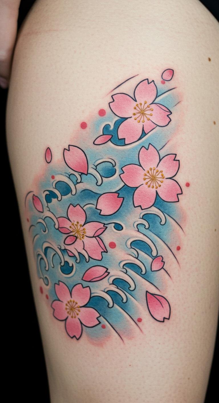 Waves with cherry blossoms mix flow and fleeting beauty, perfect for a meaningful design. See blossoms drifting on the waves, representing life’s cycles. Try this on your shoulder for a hidden gem. Save money by finding free design apps to customize ideas at home. A simple tip: use stickers on your body to preview the look before ink. Opt for a compact version if you’re watching expenses—it takes less time in the chair. Practice drawing the elements with basic art supplies. Bold the advice: preview with stickers. This approach keeps your tattoo personal and easy to achieve on a tight budget.