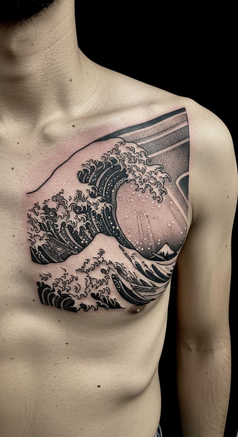 A geometric wave fusion mixes sharp lines with traditional waves for a modern twist. See angles cutting through curves on your chest. This style stands out in a subtle way. Use free design software to experiment at home. A budget tip: opt for black ink only to simplify the process. Test with geometric stencils from craft stores. Bold this: experiment digitally. It helps you create a unique look without extra expense.