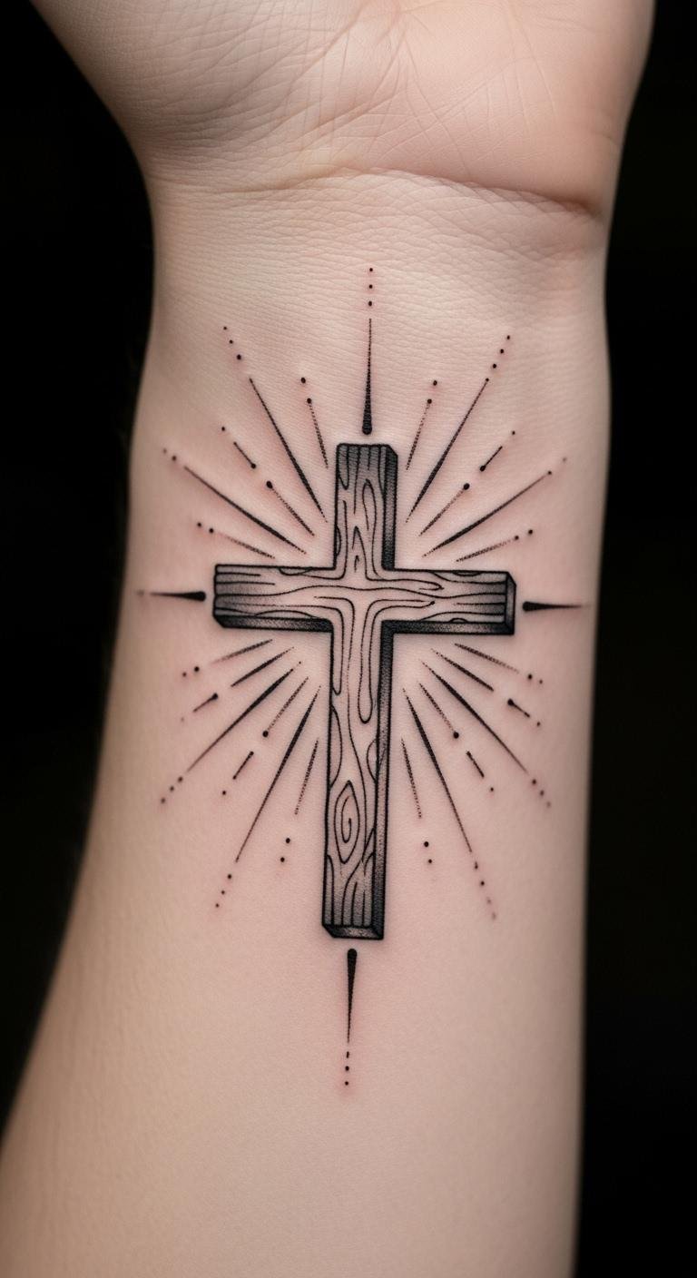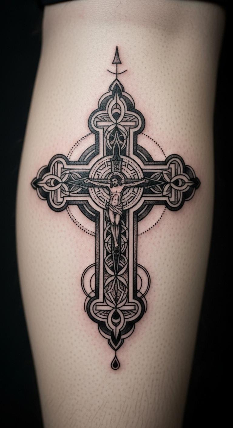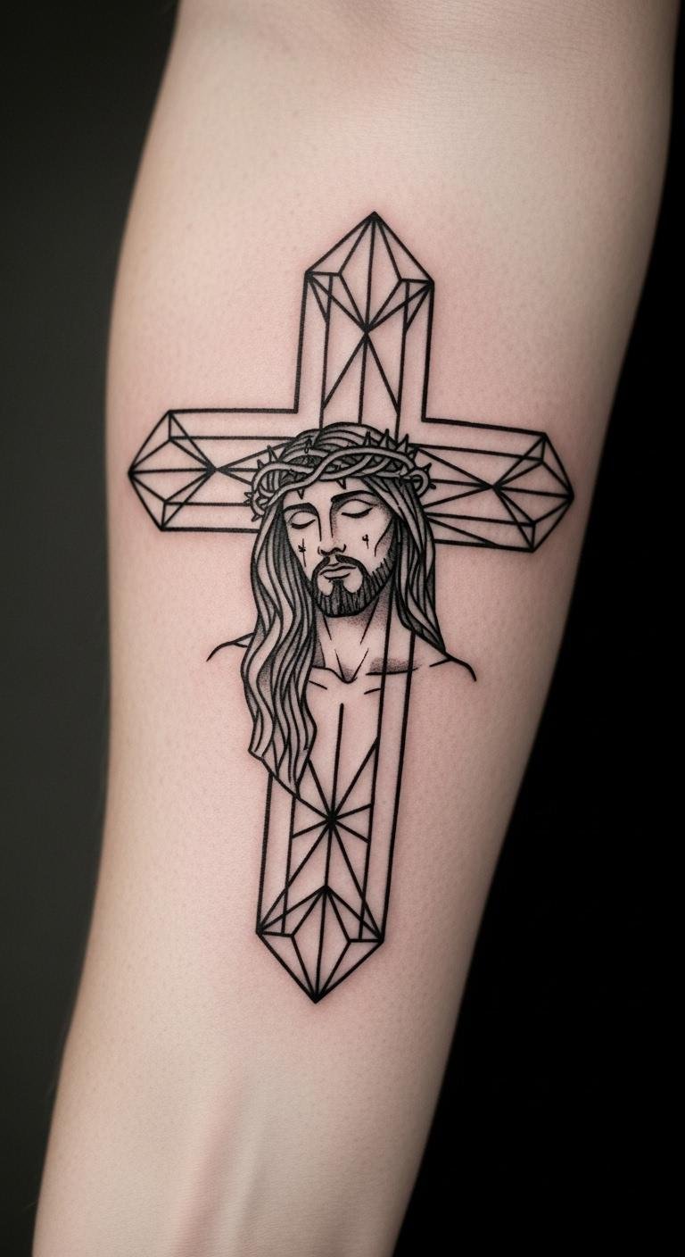 Shapes around a cross make it modern. Opt for your forearm to show it off. Prices around $100 for clean work. Use grid paper to design shapes yourself. Build it step by step at home. Stay within budget this way. Focus on: geometric cross. Test with string layouts. Find deals at local studios. It adds a fresh twist to tradition.