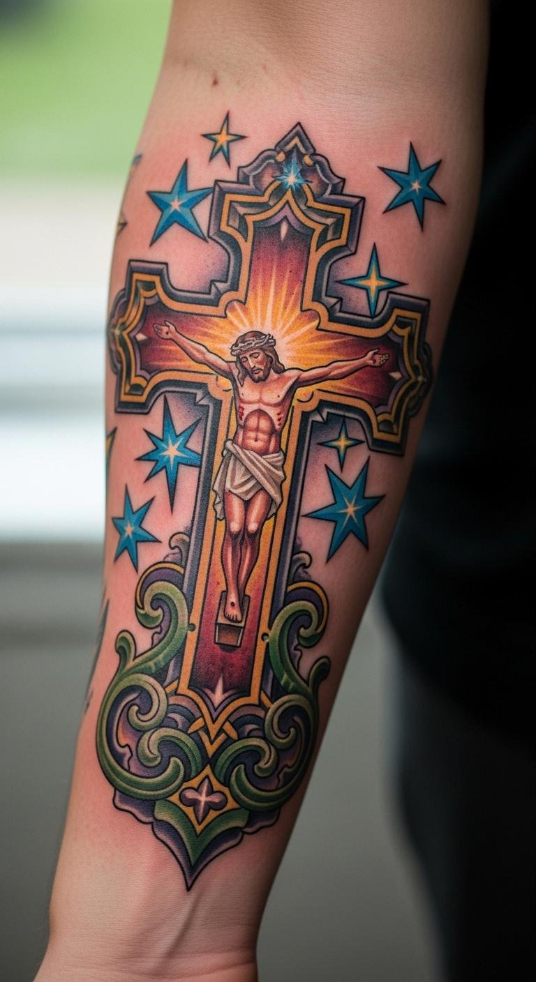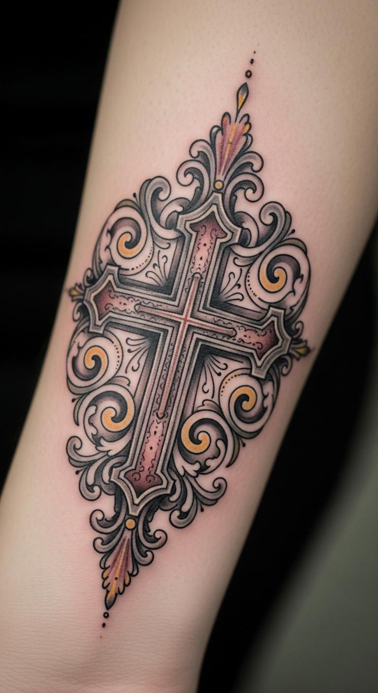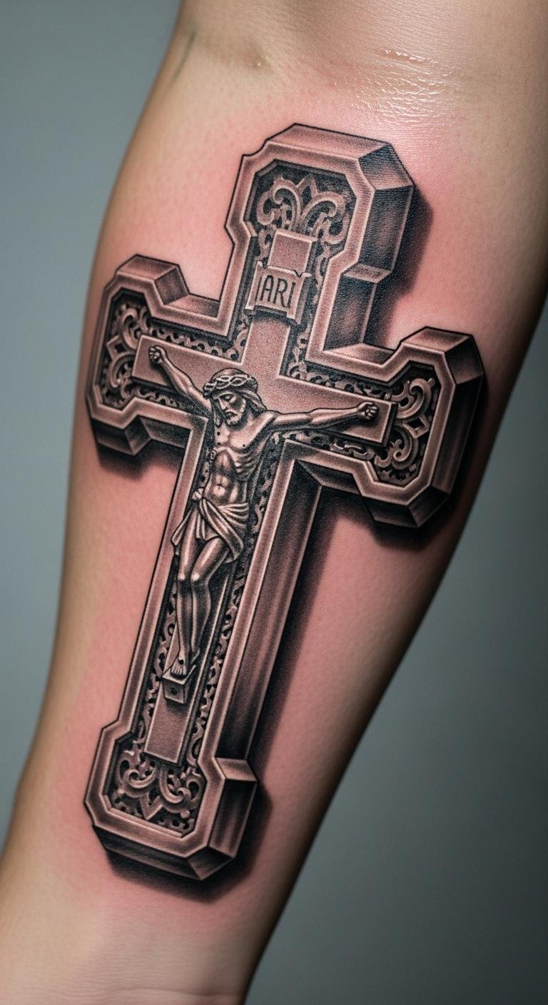 Shapes around a cross make it modern. Opt for your forearm to show it off. Prices around $100 for clean work. Use grid paper to design shapes yourself. Build it step by step at home. Stay within budget this way. Focus on: geometric cross. Test with string layouts. Find deals at local studios. It adds a fresh twist to tradition.