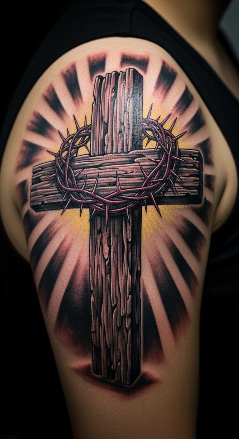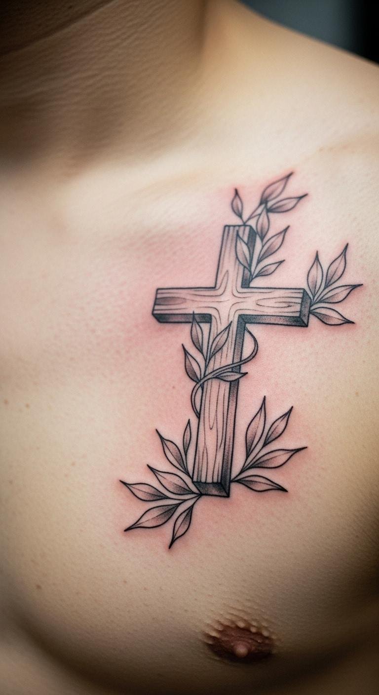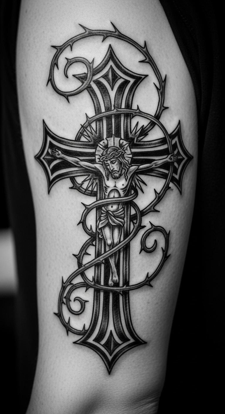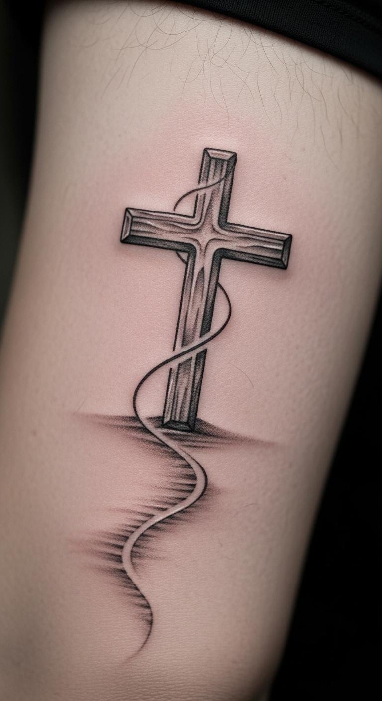 This design shows power in tough times. Place it on your bicep for a strong look. Expect to pay $70 for something simple. Download free design tools on your phone. Sketch vines around the cross at home. It keeps things budget-friendly. Note the key: strength cross. Use temporary inks for trials. Check community boards for affordable artists. Wear it as a reminder every day.