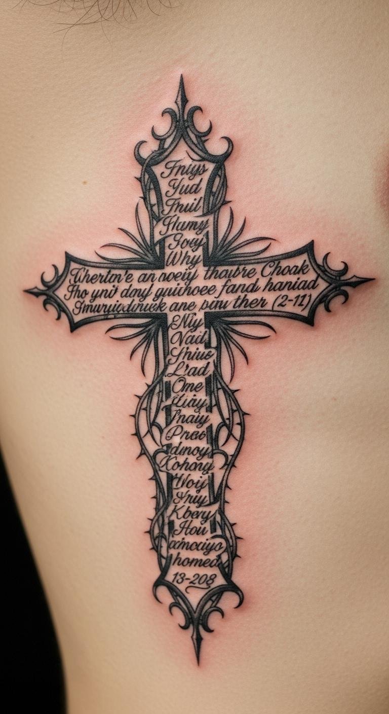 Add words from scriptures for extra meaning. Place it on your rib for intimacy. Around $80 for text work. Write verses on paper to test. Incorporate them yourself. This saves money fast. Bold: Bible verses cross. Practice with sticky notes. Find budget-friendly shops. It makes your tattoo personal.