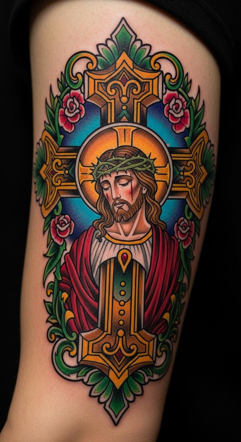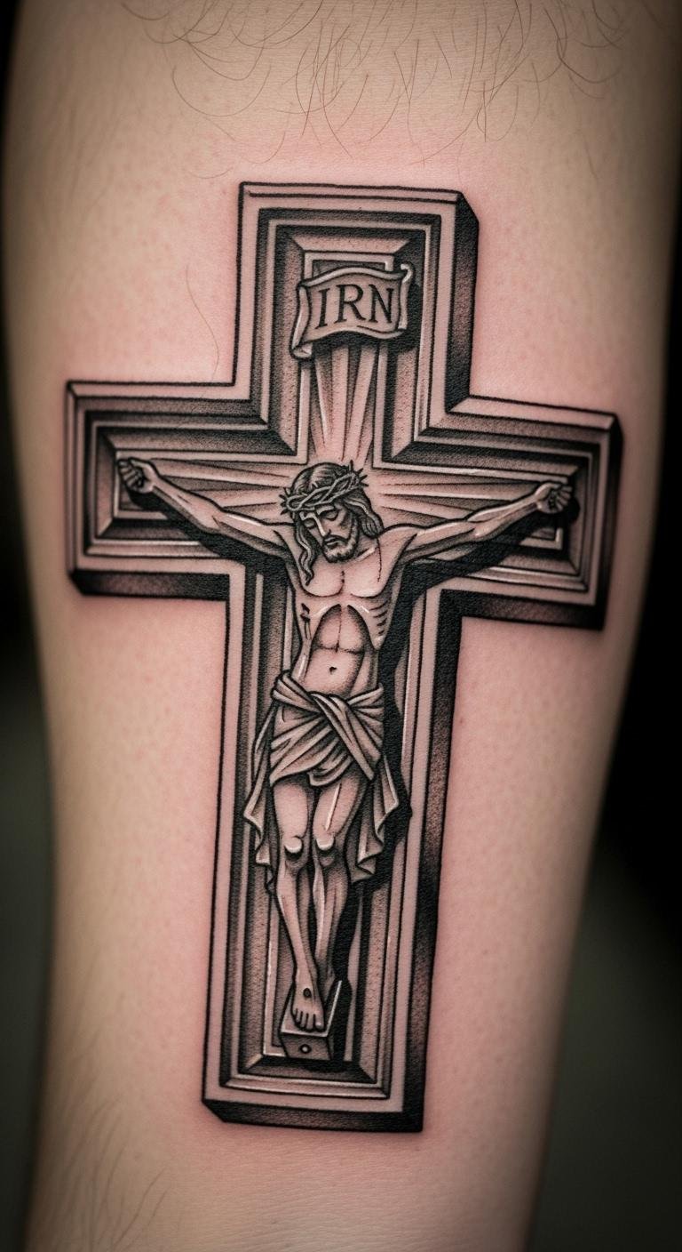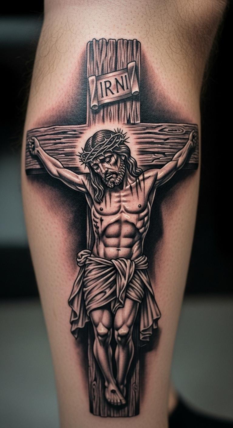 This classic image carries deep history. Go for your leg to hide or show. Prices start at $110 for detail. Find free templates to copy. Add shades with pencils first. It’s practical and low-cost. Key: Jesus on cross. Experiment with photo edits. Seek experienced artists nearby. It holds timeless value.