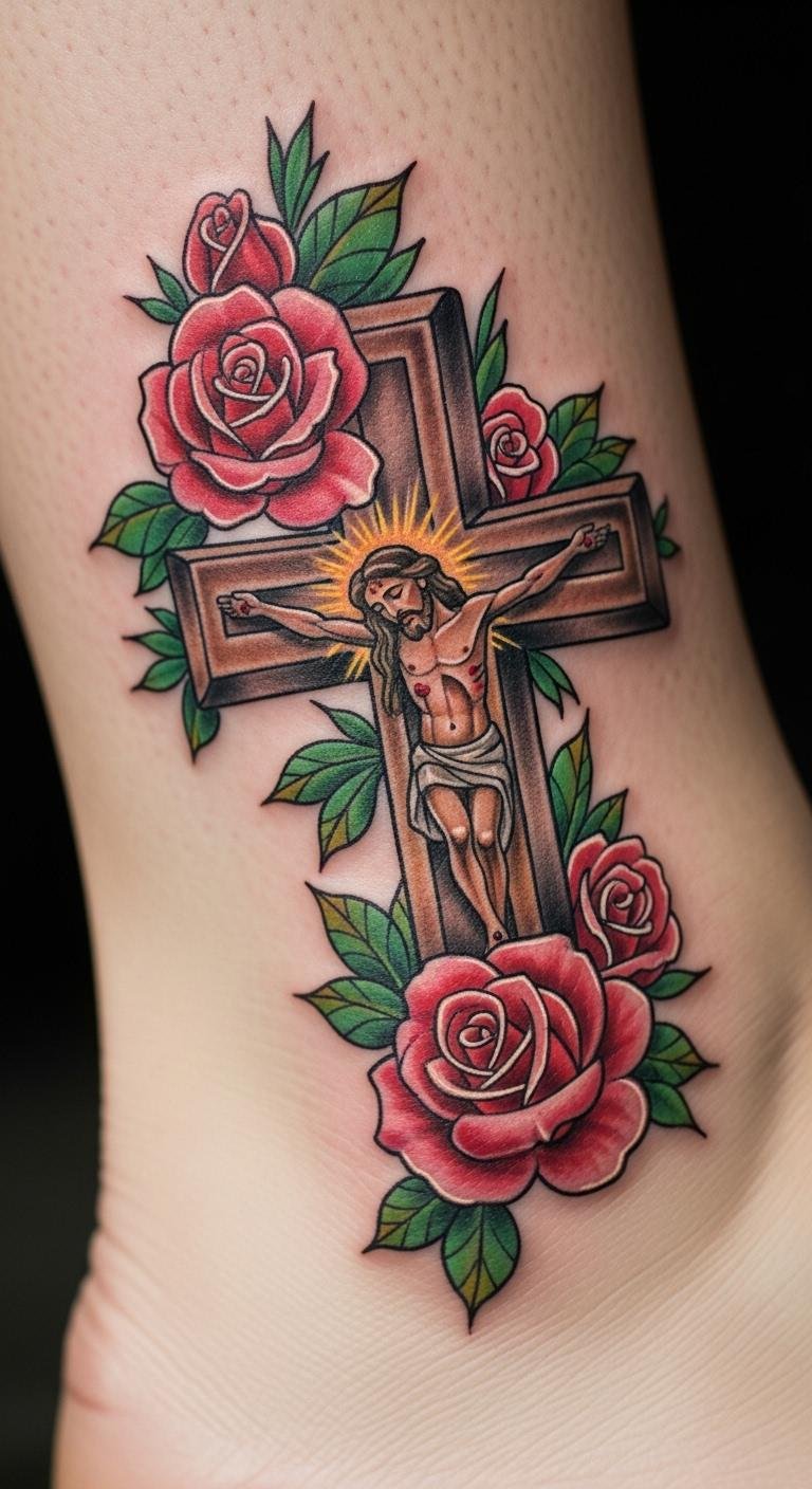 Flowers with a cross bring beauty and faith. Place it on your ankle for subtlety. Expect $85 for color work. Sketch roses using free online guides. Blend them in at home. This cuts expenses nicely. Highlight: rose cross. Try fabric stamps for tests. Check for sales at tattoo spots. It combines grace with belief.
