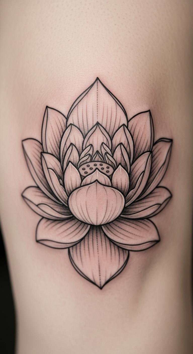 Lotus tattoos on the knee mean purity and growth. Petals create a serene vibe. Sketch on paper easily. Use store-bought temporaries. Opt for simple versions. Fit it to the curve. Select skilled artists. Add water drops. Care with everyday items. Enhance your style quietly.
