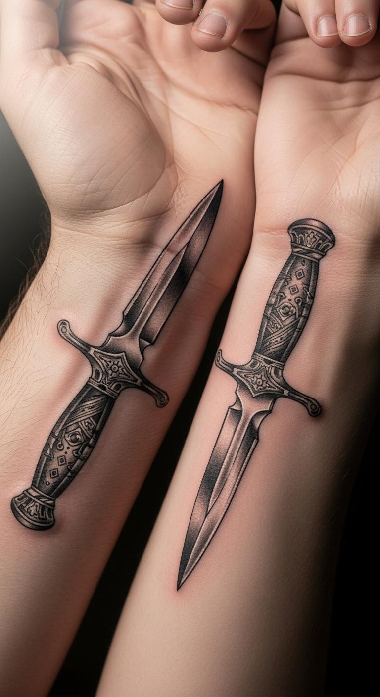 Share the ink together. Matching knife tattoos use similar designs on wrists. Look for duo deals to save. Draw matching sketches at home. Place them side by side. Cost per pair around $160. Heal with shared routines. Practice with couple sketches.