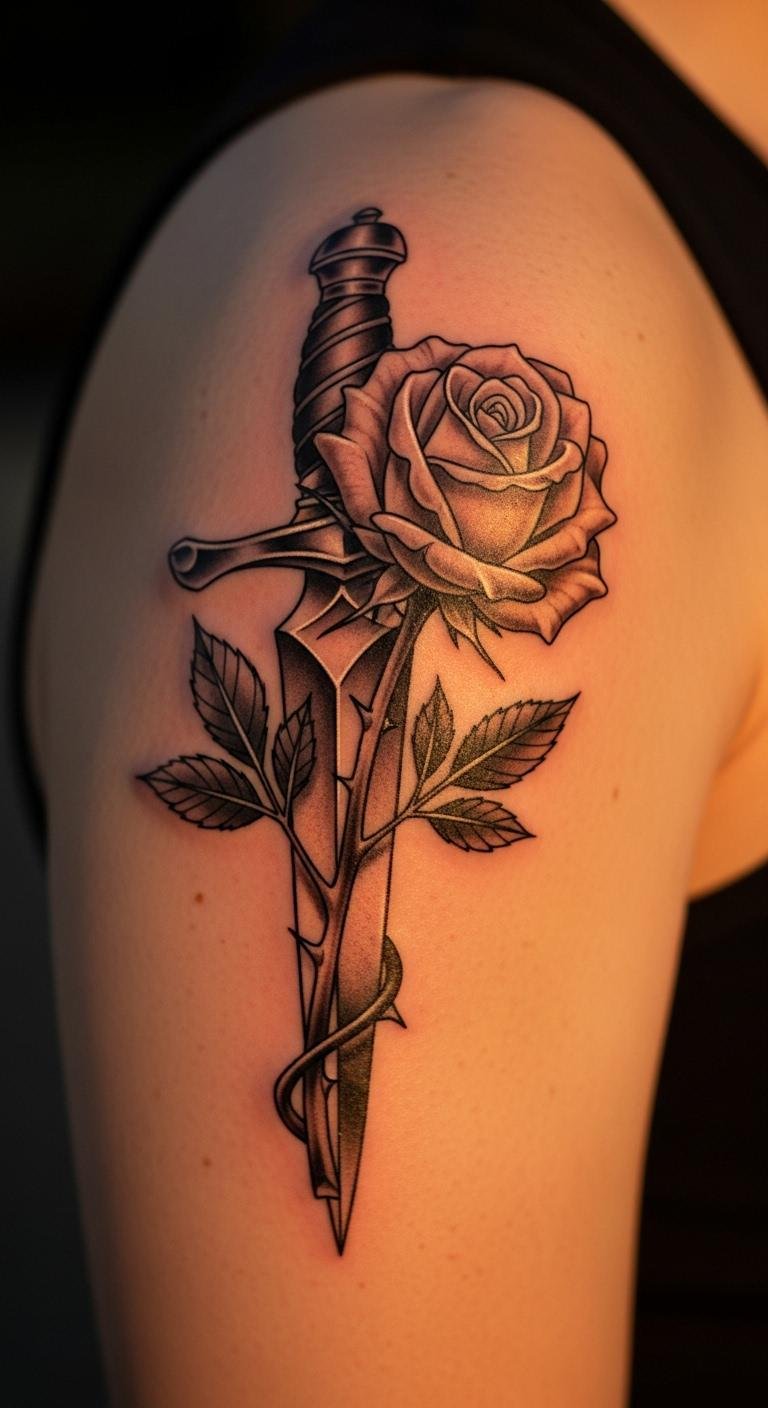 Knife and Rose Combination Tattoo