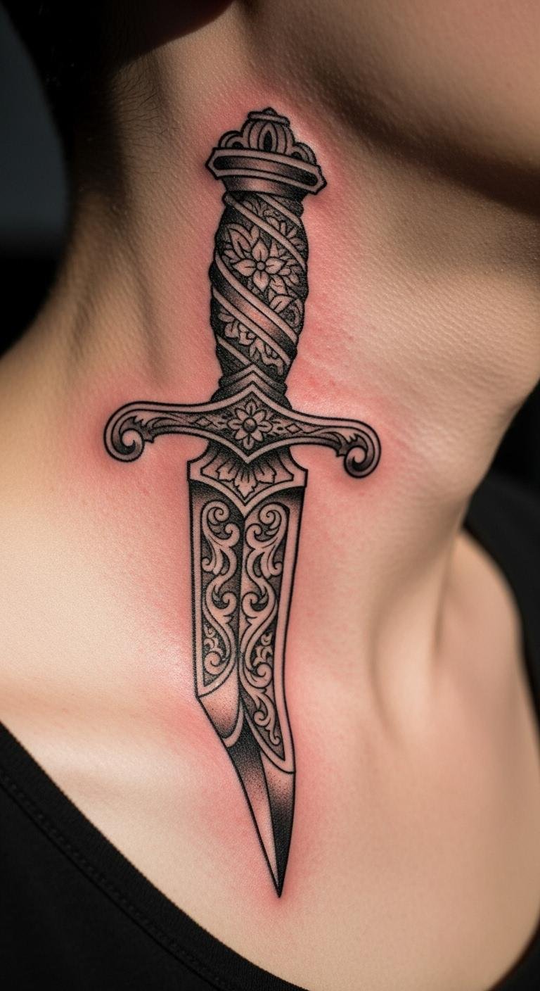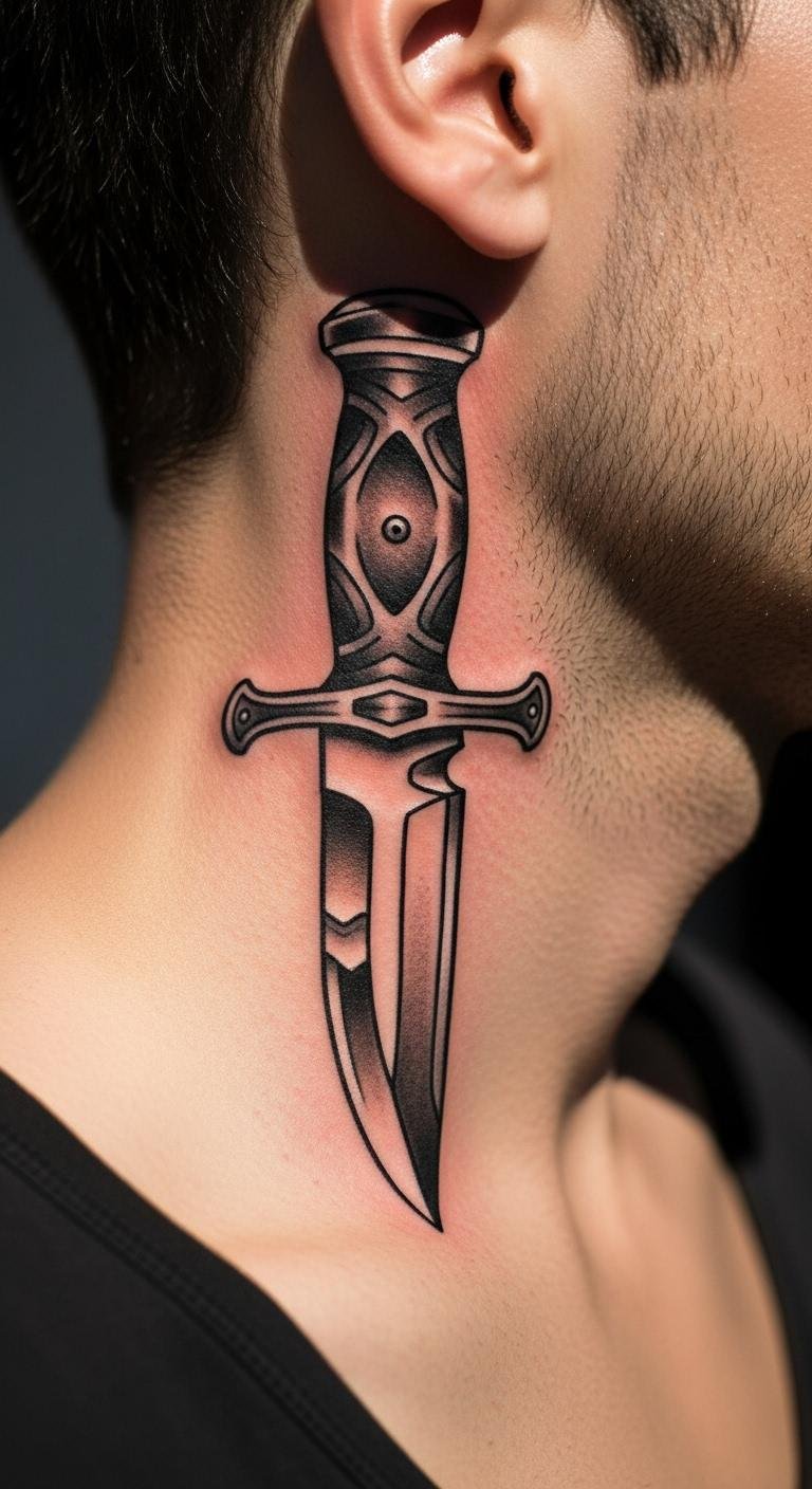 Bold Knife Tattoo on Neck