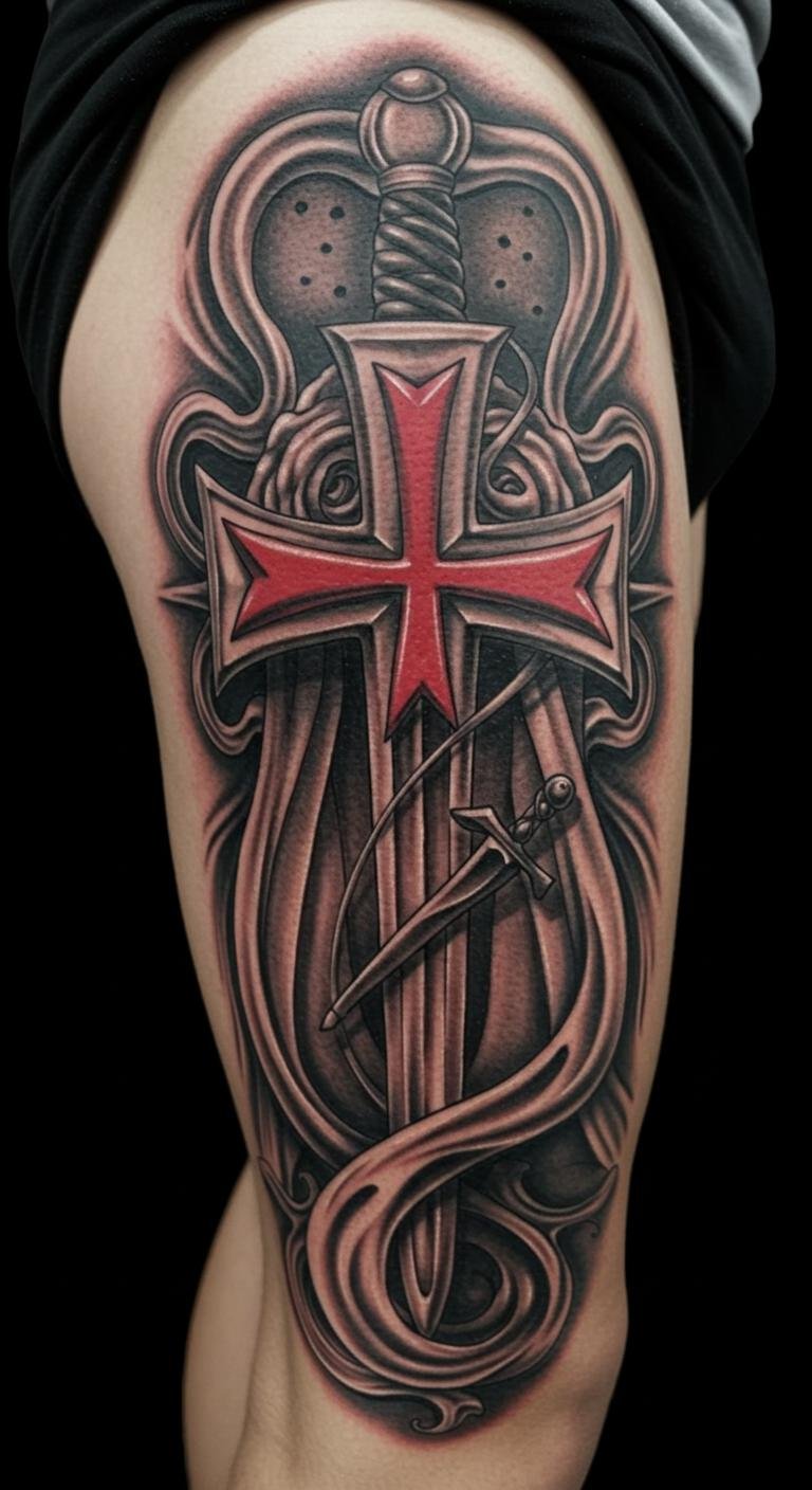 Strengthen your leg. A sword and cross on your thigh blend symbols. Sketch on paper first. Price: $200 to $600. Search for deals online. Break into sessions. Personalize the blade. Try henna versions. This tattoo empowers motion. Use gray for depth. Step into bravery.