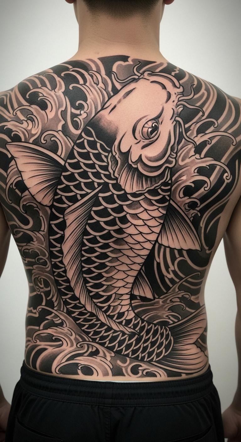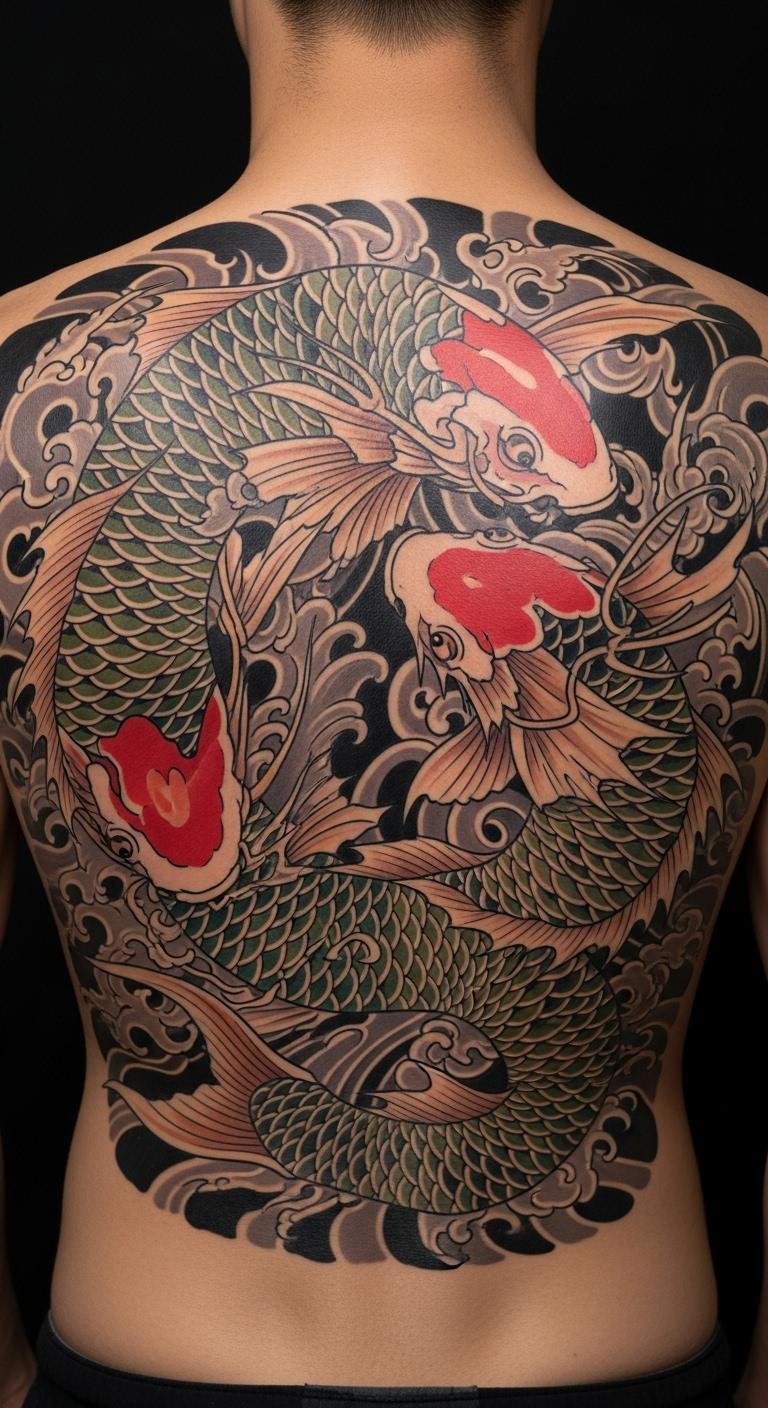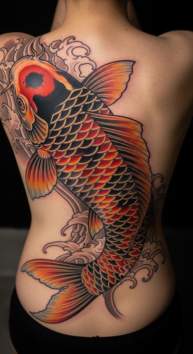 Let the koi wrap your back like a shield. It represents full-circle growth. Trace templates on paper. Supplies are cheap at $3. Search for artists offering packages. Prices: $150–$300. Position it to cover what matters. Customize with elements from your past. Simpler designs cut expenses. This spot boosts posture confidence. Use body paint kits for trials, under $10. Share plans in groups for advice. It strengthens your resolve without extras.