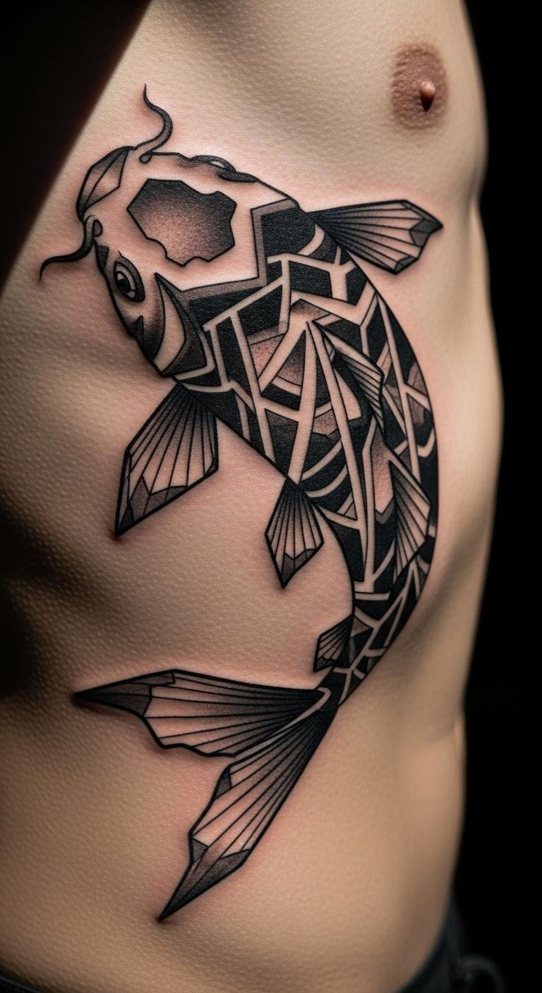 Blend koi with angles for a modern twist. It sharpens your focus. Design on grid paper. Under $5. Look for geometric experts. Cost: $60–$120. Side placement adds edge. Incorporate your shapes. This keeps costs geometric. Use it for clear mindset. Free apps build designs. Share for quick feedback.