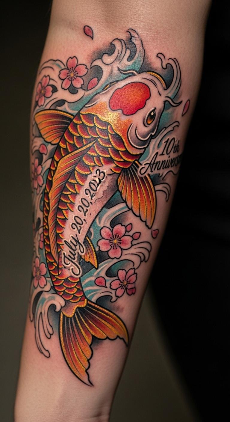 Mark milestones with your koi. It locks in your wins. Note dates on paper. Free. Custom artists: $50–$100. Forearm for recall. Add your dates. Simple for savings. This design keys motivation. Use calendars for ideas.