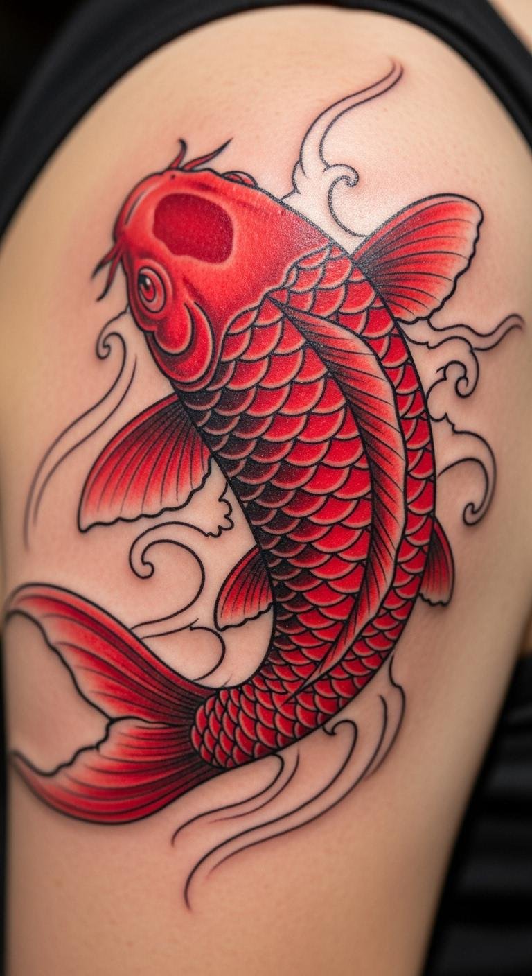 Red koi stands for passion and drive. It wakes up your spirit each morning. Color in drawings with markers. Buy a set for $5. Look for artists who handle bright inks. Expect $60–$120 for this. Put it on your shoulder for easy access. Pair it with symbols of your goals. Simple versions save money. This design energizes workouts or meetings. Share sketches in community forums for input. It’s free and helpful. Use fabric markers on clothes to test. They cost pennies. Keep your choice meaningful and straightforward.