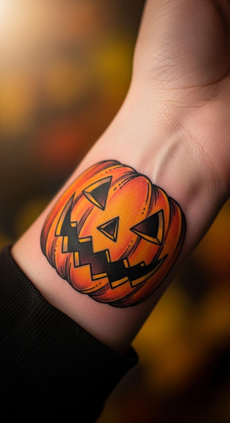 Celebrate fall with this theme. A jack-o’-lantern tattoo feels timely. Sketch it with orange crayons on paper. Wrist placement keeps it handy. Choose simple versions for less money. Look for holiday deals from artists. Personalize with a face that reflects you. Protect with basic tape. It’s perfect for the season.