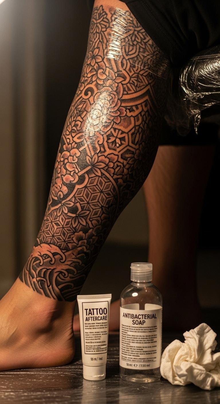 Aftercare keeps your leg tattoo looking good. Clean it daily with soap. Wrap in breathable cloth. Moisturize with lotion. Change routines as needed. This helps healing. Use household items. Simple steps work.