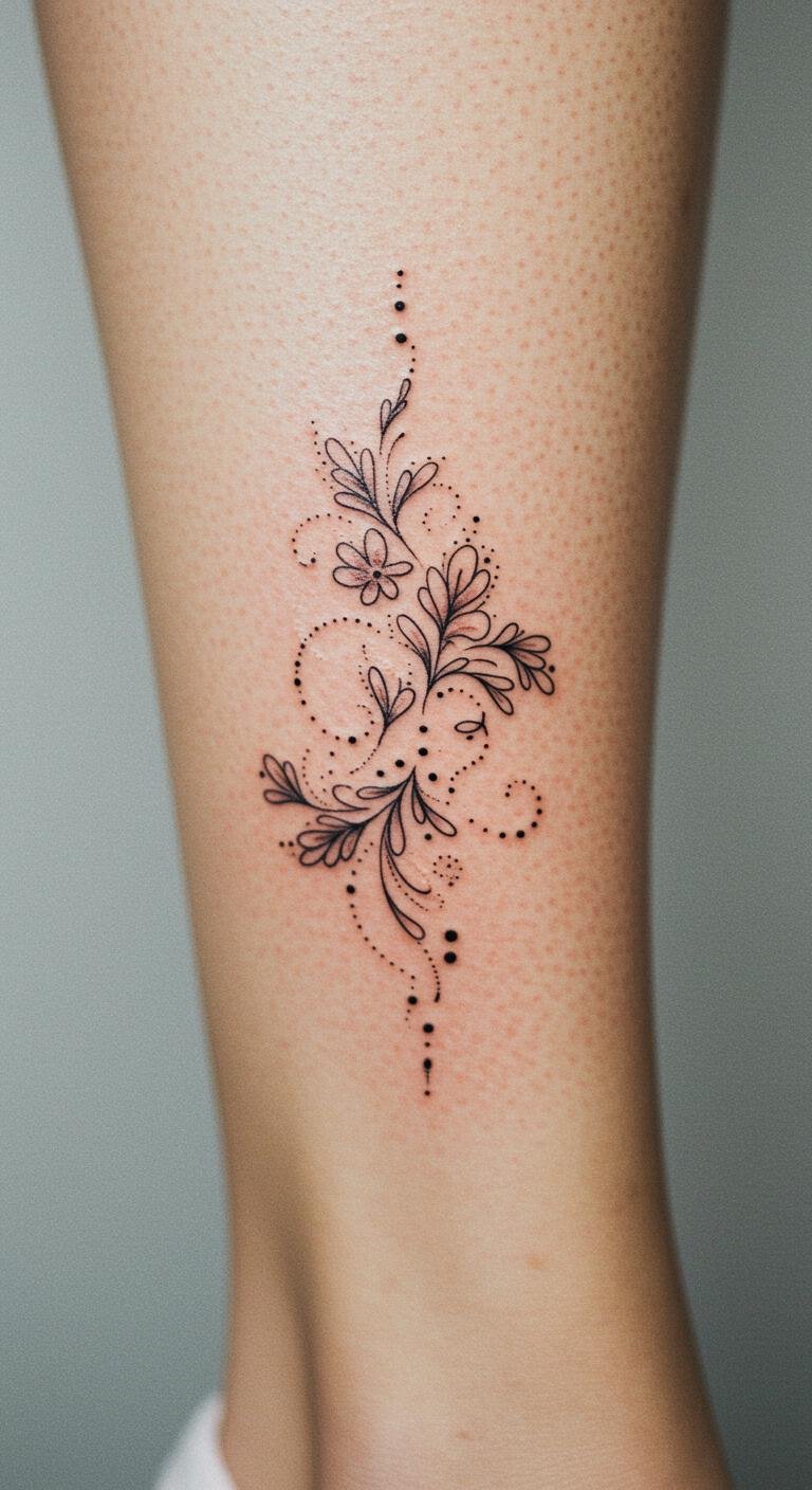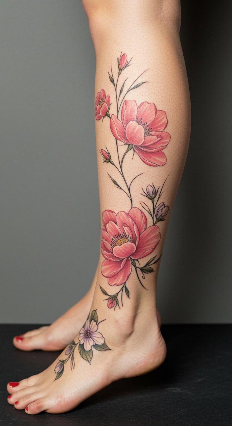Feminine floral leg tattoos bring grace. Flowers on your lower leg add softness. They enhance your personal style. Gather petal ideas from nature walks. Draw them simply on paper. Look for themed artist sessions. Prices fit easy planning. Wear them with dresses for fun.