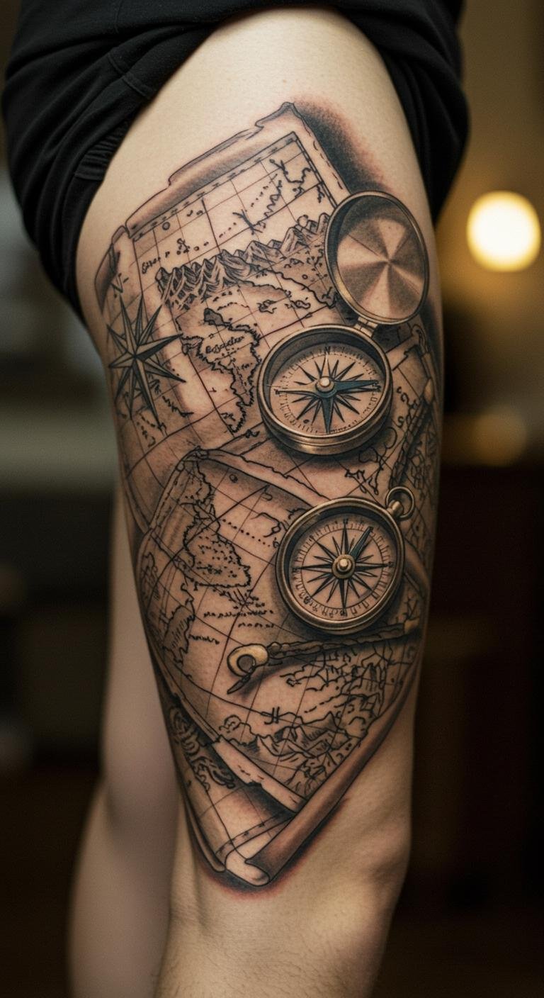 Adventure theme leg tattoos spark wanderlust. A map on your thigh reminds you of trips. They fit active lifestyles. Collect travel pics for inspiration. Sketch routes on paper. Find outdoor artist events. Costs align with your plans.