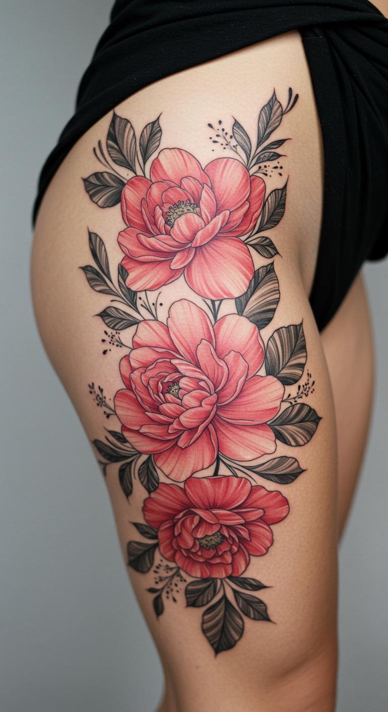 Floral thigh designs add a touch of nature to your style. Imagine roses or leaves blooming on your thigh. They create a soft, feminine vibe. This spot lets you hide or show them as you like. Search free image sites for ideas to sketch at home. Use washable markers to try layouts on your leg. Find budget artists through local events. A small design could cost around $50. Keep it simple with one flower to start. These tattoos pair great with skirts for summer fun.