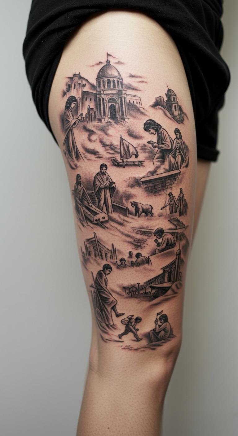 Storytelling narrative leg tattoos tell tales. A sequence on your thigh shares your journey. They engage viewers. Outline your story in notes. Draw panels at home. Get advice from artists. This adds layers to your ink.
