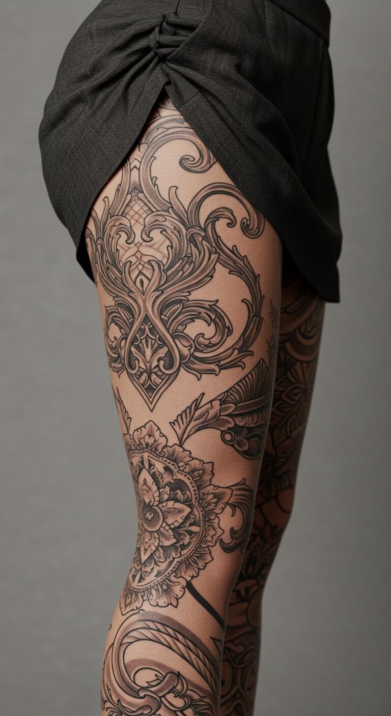 Fashion-paired leg tattoos complement clothes. A pattern on your thigh matches skirts. They enhance your wardrobe. Experiment with your closet. Snap photos for ideas. This makes dressing enjoyable.