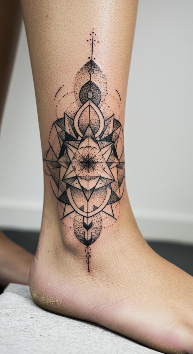 Geometric ankle tattoos offer clean, modern shapes. Think triangles or circles stacked neatly. They give your ankle a structured look. This area works well for daily activities. Browse free templates online and draw them yourself. Practice with a pencil on paper first. Seek out affordable studios with walk-in options. Prices start at $40 for basics. Wrap the area with breathable bandages after. These designs stand out with jeans or shorts.