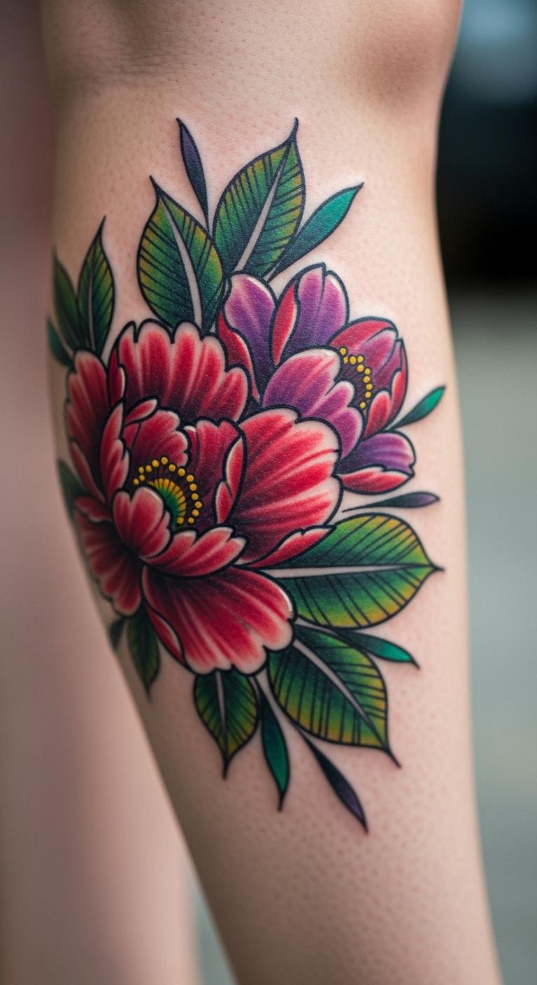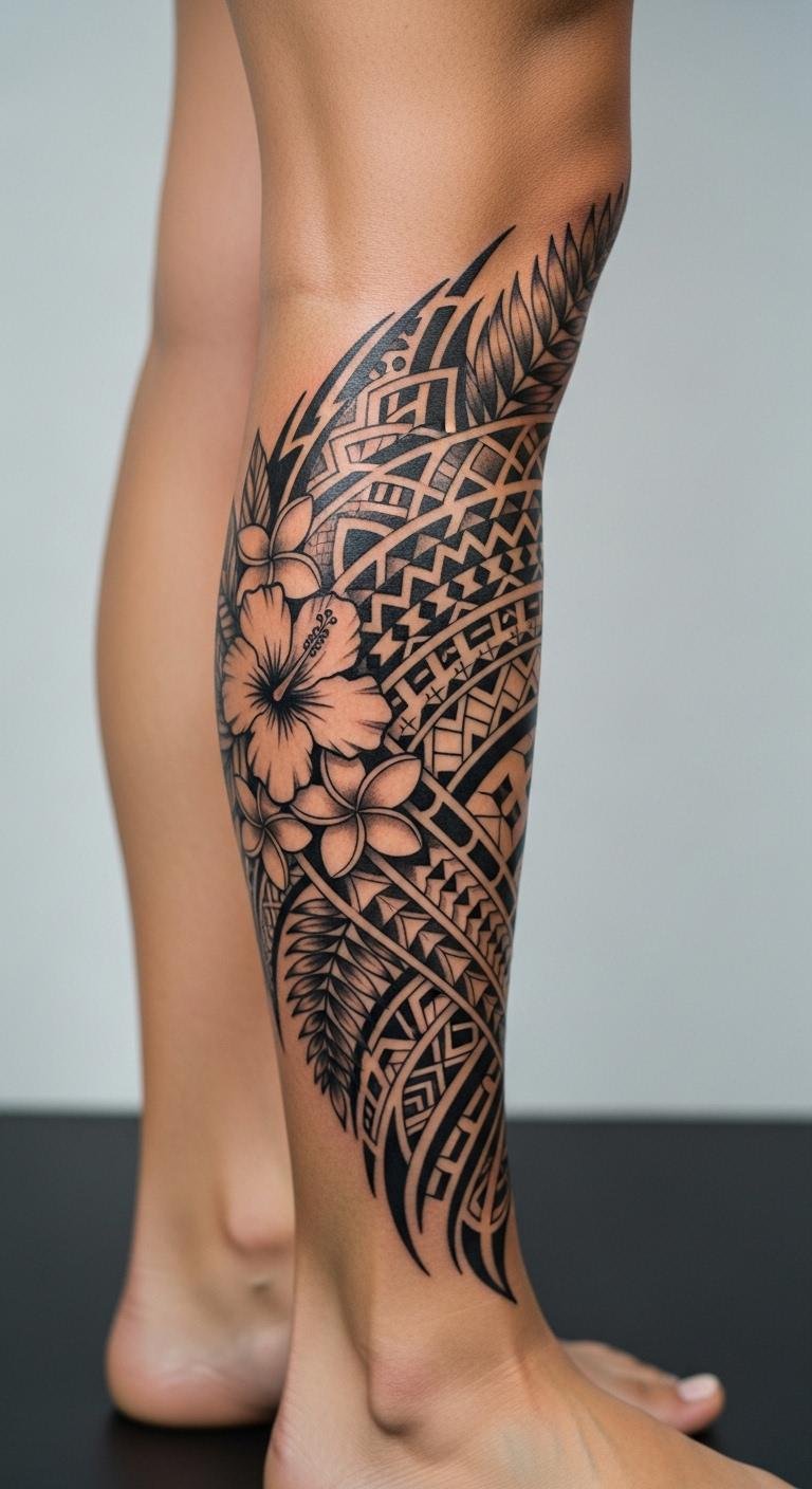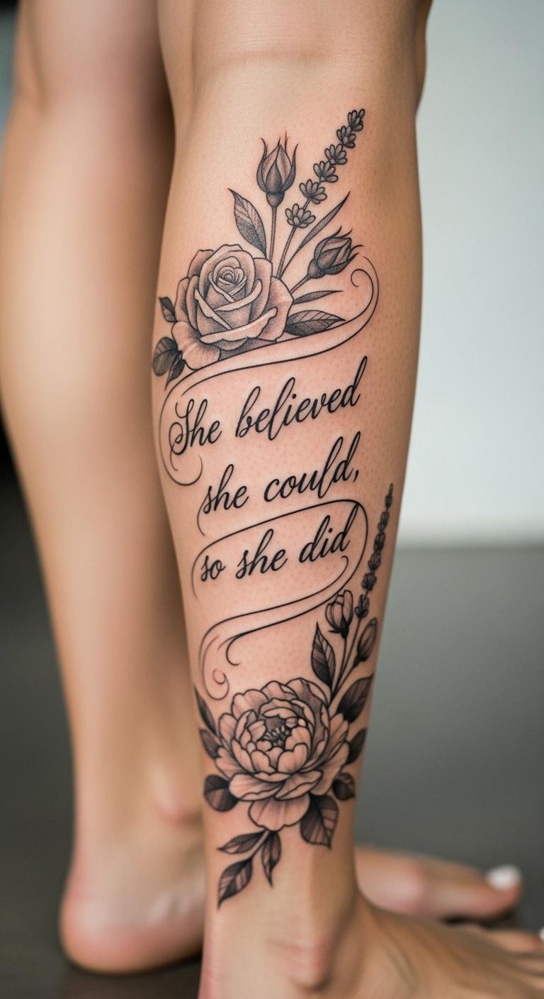 Think about flowers on your leg for a fresh vibe. Flowers like roses or lilies make a bold statement. They wrap around the calf or thigh nicely. Start by sketching ideas on paper. Use free apps to draw your design. This costs nothing and helps plan. Pick a local artist for under $100 if you’re budget-conscious. Keep it simple with black ink first. Add color later if you like. These tattoos stand out in summer outfits. Try mixing with vines for a custom touch. Get friends’ opinions before going ahead. You’ll love how it highlights your leg shape.