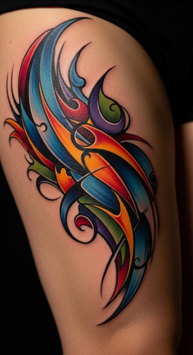 Thigh tattoos offer private expression. Abstract shapes or figures shine here. Cover with pants as you wish. Sketch on fabric to test. Use old clothes for practice. Look for sessions under $100. Keep designs small for deals. These empower daily routines. Add layers over time. It’s versatile for your style.