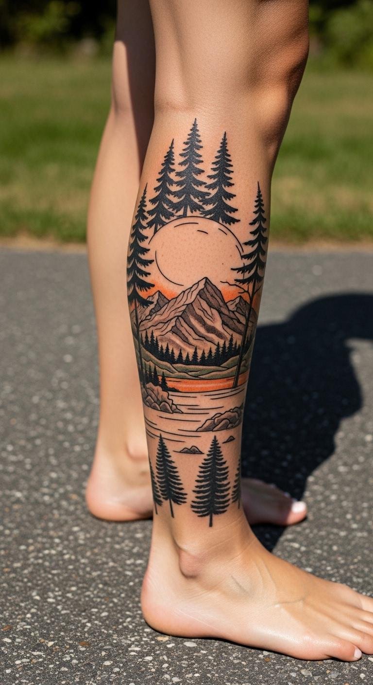 Nature tattoos bring outdoors to your leg. Trees or mountains evoke peace. Put on the lower leg for balance. Draw scenes with crayons at home. This is a fun, free activity. Artists offer for about $70. Use natural colors wisely. These pair with adventure gear. Blend elements for depth. It’s inspiring for nature lovers.