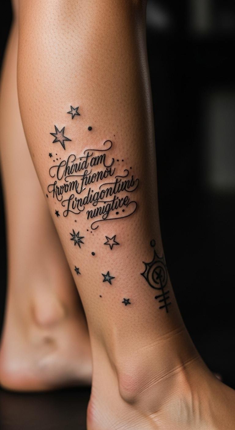 Script with symbols creates code. Words plus stars add depth. Put on the side. Write ideas in a journal. This is straightforward. Artists charge around $70. Keep text short. These inspire action. Combine for messages. It’s practical for goals.